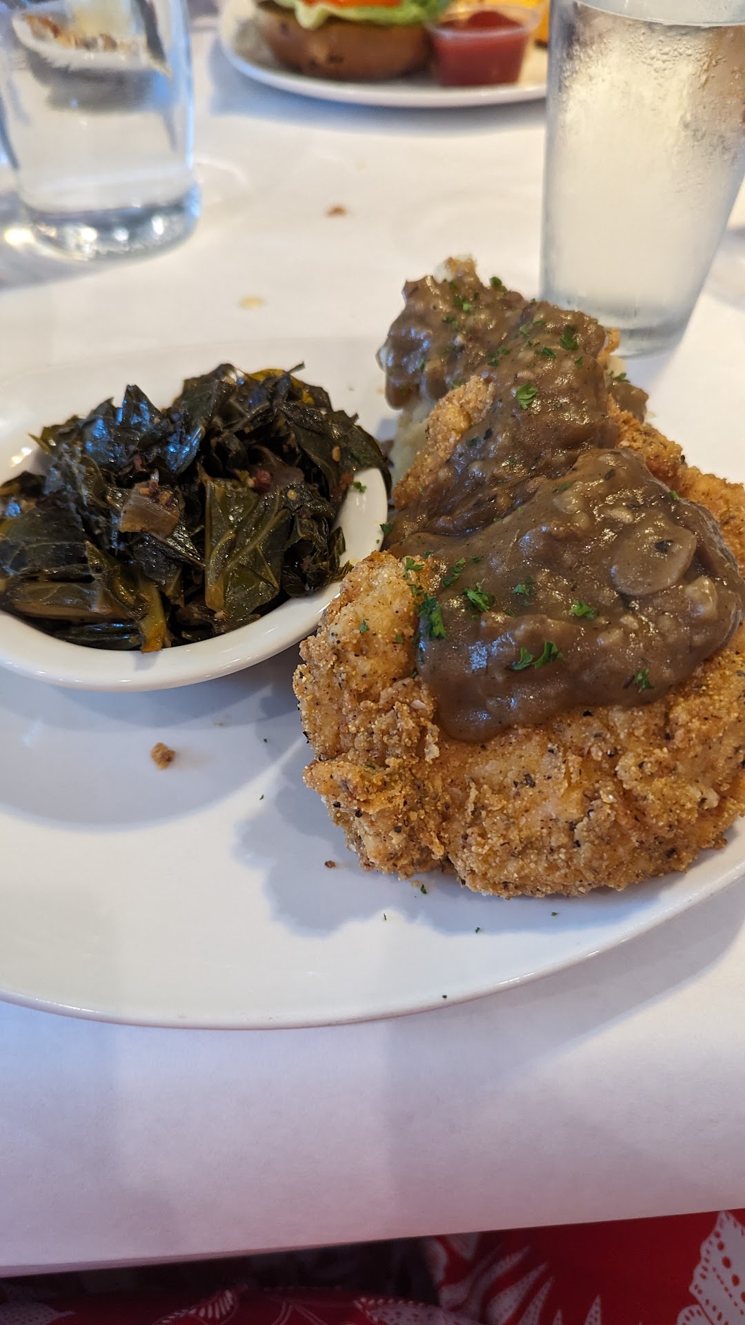 I really want to like this place but there were several strikes for me, others might not have the same perspective. The special was a Low Country Boil, as I love something like Frogmore Stew, but this just sounded like simply boiled seafood. I could tell our waitress had never seen this dish, much less tasted it. When I asked for a further description, I was told it didn't have "fresh" crab as they use up older seafood. (Needless to say, I passed on that dish). We did get the fried green tomatoes which were hot, had a nice crisp to them, they were tasty. The Hopping John was ok, but it was served cold which is unusual for me. There could have been more of the remoulade sauce. The shrimp and grits appetizer was very rich but flavorful. The grit cake was creamy & perfectly cooked. The shrimp, were small rock shrimp but correctly prepared and flavorful, the sauce was similar to a buerre blanc but definitely not what I think as traditional preparation, to me the best part of shrimp and grits is the sauce made with a great shrimp/ andouile stock, this was not that. The Country Fried Chicken was boneless chicken but it was moist inside & crispy on the outside, the breading was cornmeal, not what I think of for Southern Fried Chicken but overall good, however, I would never expect brown gravy on Southern Fried Chicken. It was served with collard greens that were really great. Nice level of vinegar and very flavorful, probably the best bite that I had. They were also served with mashed potatoes which were almost cold, but they had the unexpected brown gravy so I wasn't planning on eating them anyway. Dinner came with biscuits which have garlic and onion in them, again another item that didn't work for me although the biscuits had a nice rise, and were light and fluffy. When asked what was in the biscuits, our waitress had to ask the kitchen, I'm not sure if she's even ever tasted a biscuit before. Feedback for management: 1-The menu really should describe your dishes including sauces. When I went back and looked much of what I had issue with, most wasn't even described on the menu. 2- Let your staff taste your food! Likely our waitress was new but it sure seemed you're not setting her up...