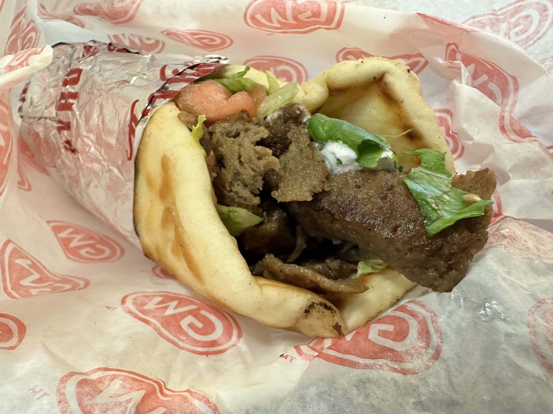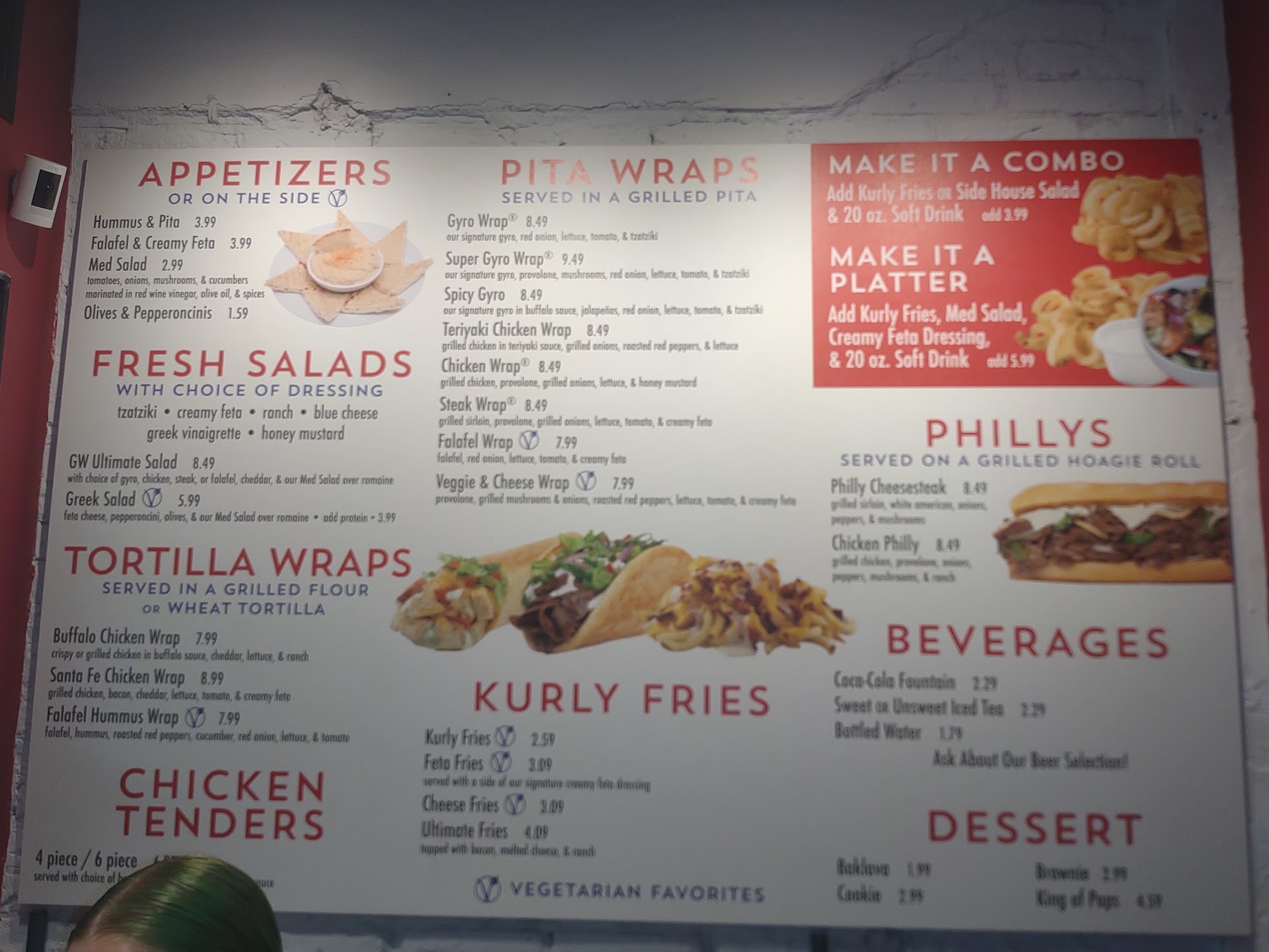 Read moreI've had my fair share of authentic Mediterranean gyro's ("year-o"). Good atmosphere and service here, but the food didn't really meet expectations. I'd say it's on the lower end of my gyro experiences in terms of flavor. The portion size was a little smaller than expected and the gyro meat was a bit too salty and dry. The tzatziki ("tsót-siki") sauce had good flavor, but some extra would have been nice to dip it in - it's 75¢ extra for additional sauce, however, so I didn't end up getting that. Fries were very good and having them unsalted definitely balanced with the saltines of the gyro meat. I'll add a photo of a more updated menu - being that the last one didn't label tomatoes and onion in the gyro. This one is more updated. Good hang out spot if anything and fairly affordable. About $10-13 average per person depending on how much...