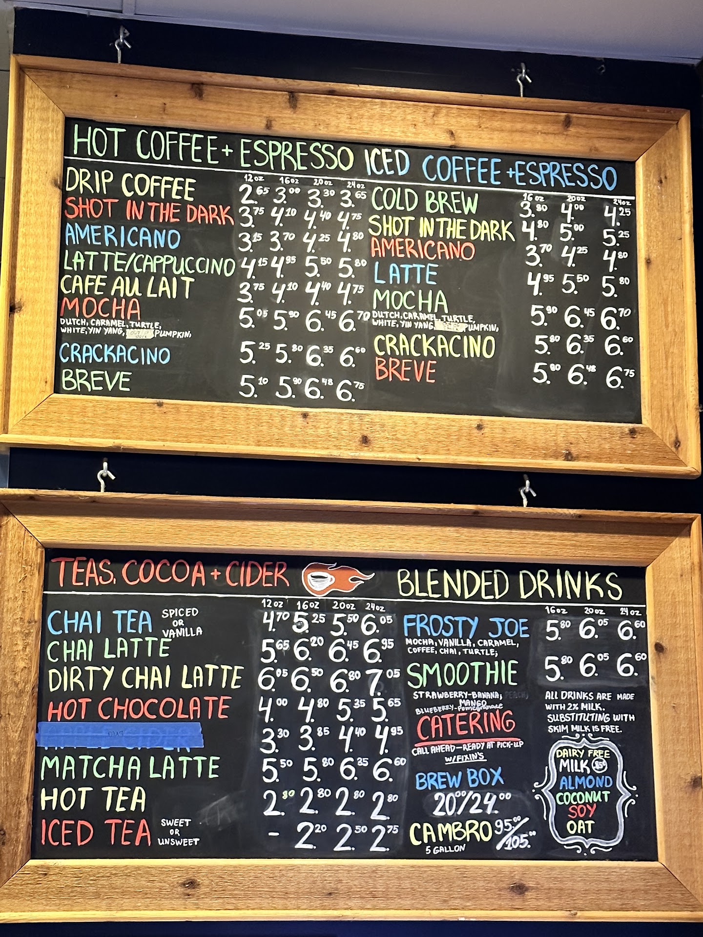 Read moreIt's a tad on the expensive side, especially since it seems to primarily serve college students. Of course it also seems to employ primarily college students, so that's good. It has a few nice original drink options. And quality classics. They do what they can to provide places to plug in, even if it's just an extension cord or power strip. They close rather early (8pm) but are open about the fact that their wifi reaches outside, which is public property. Wifi isn't great for video calls, but it's sufficient. This has been a quiet, study environment for years. No more comfortable spots like they had when they were on the corner, but sufficient seating. Good service and some other expensive local options as well as more commercial drink options. Merchandise sold and for each menu item, you get a punch out in your card (if you ask for a card), and after the tenth, you can choose a free menu drink. (Drinks from the fridge not included). Parking is a bit limited during the day, but after 6pm, there's...