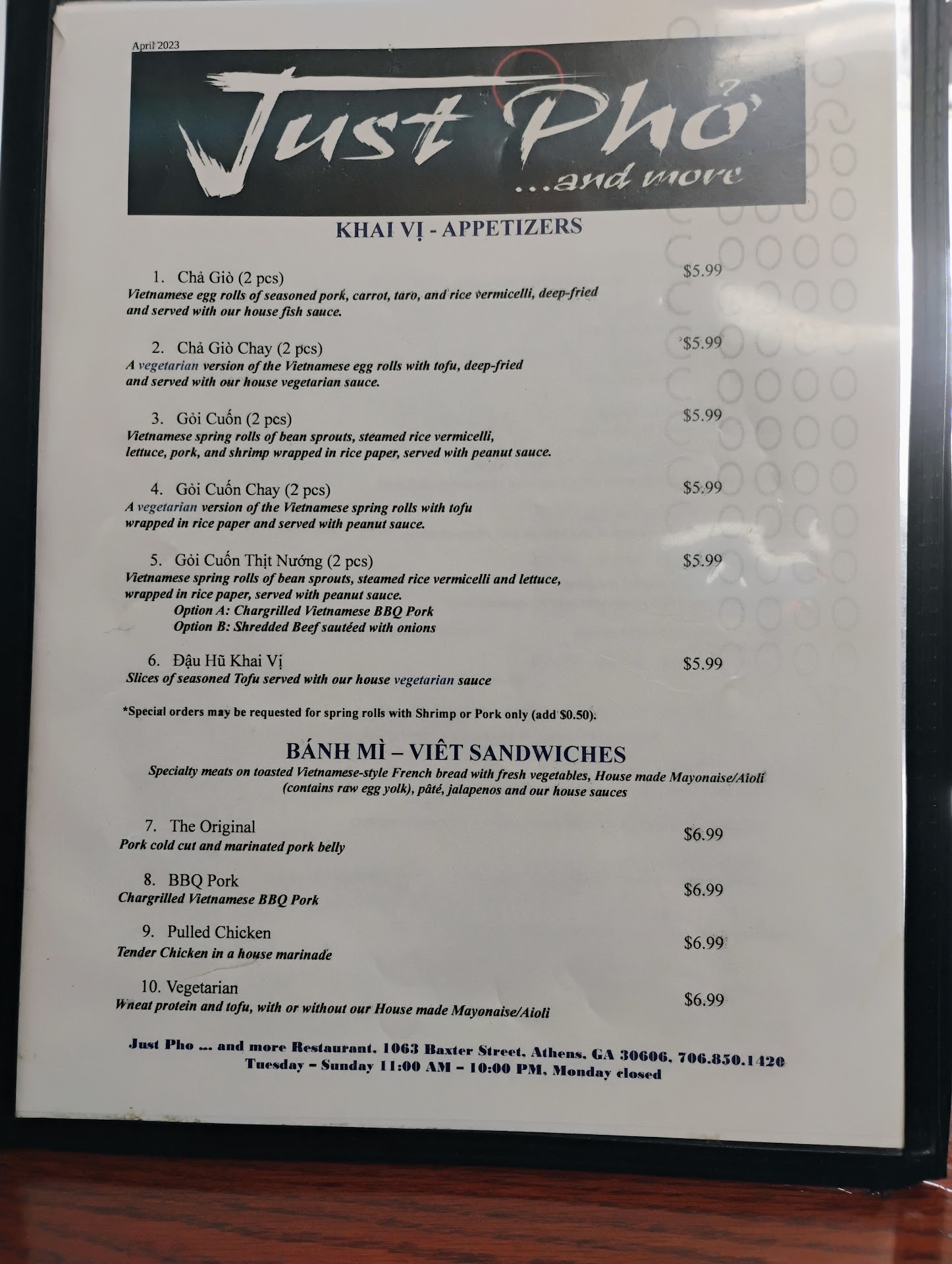 Worst dining experience EVER. My husband and I were not allowed to be seated and look at a menu bc we didn’t have masks with us, but they wouldn’t provide one either. We had to pay before receiving any food. The first impression was horrible, but we decided to stay. Bad mistake. We had to get our food from the back of the restaurant ourselves - it was never served. We had about two little cups of sauce and were refused any extra sauces. The guy was super rude and having such a nasty attitude when all we wanted was to enjoy a nice meal. After that experience, we decided not to touch our food - we wanted to just get our money back and leave, but they refused to refund us. So not to throw away our money, we stayed and ate. The pho wasn’t terrible, but not the best that we’ve had by any means. After this whole awkward ordeal, the owner comes in and we hear the guy complaining about us in the back to the owner - we heard every word. The owner then comes to us and apologizes for our bad experience and “tried to make things right” but all she did was lecture us as to why they don’t serve food anymore and why they only give so much sauce. I was then guilt-tripped for not finishing all of my broth...we will definitely never be coming back here and although other pho places in Athens are a tad more pricey, I’d rather pay more and have decent service than what I experienced here. So sad and unfortunate we had the experience that we did, but we learned our lesson. Stick with your gut, and if something...