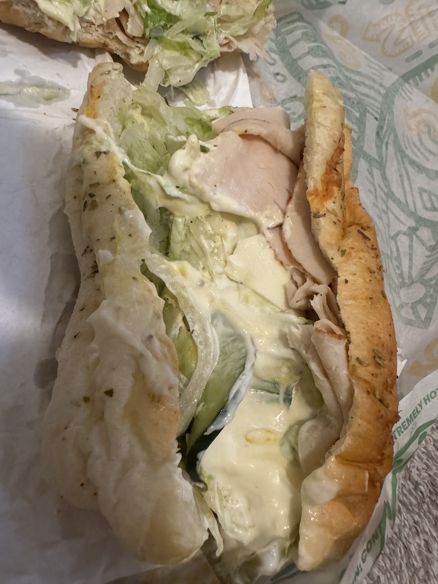 I would usually never make a bad review for something being off about my food order but today I just felt the need to. I came and got a sandwich today and the lady taking my order was already rushing and having an attitude. She made my sandwich very messy and I asked for mayo and she put the smallest amount ever, I used to work at subway and I know they have certain amounts they have to put on each sandwich. So I asked for alittle extra and she proceeded to put way too much mayo on the sandwich and now itâs pretty much not edible. My sandwich is literally swimming in mayo, all my toppings are soggy and gross and it is very disappointing when I ordered a footlong to have leftovers for later and I couldnât even eat the first half. Mind you the sandwich was $10 and I...