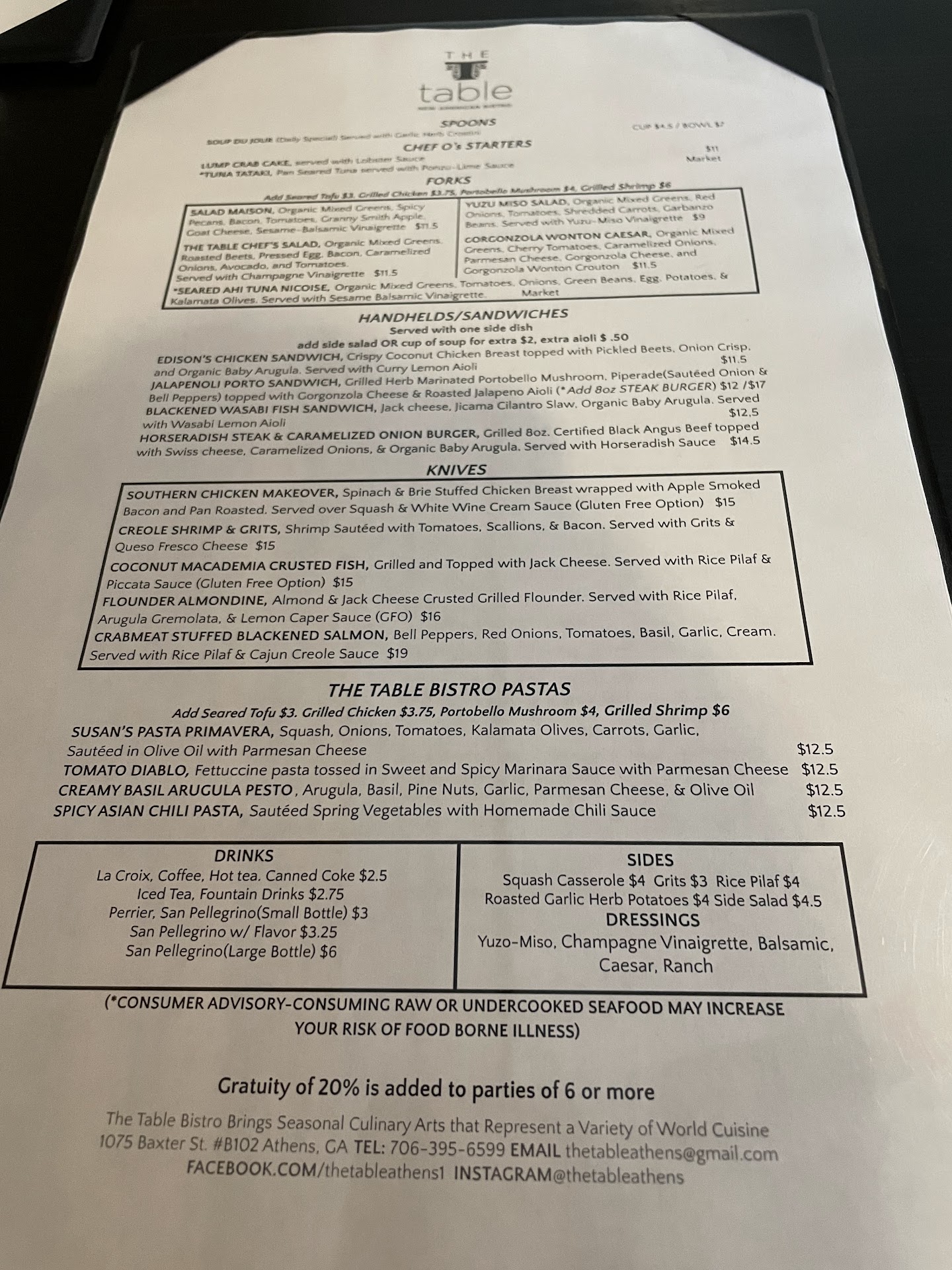 Read moreThe Table Bistro has a wonderful variety of very fresh and beautifully prepared dishes for lunch and dinner. My husband and I have had lunch and dinner there and are very impressed with the quality of the food and the friendly service. I must have gluten-free and dairy-free cuisine, which is often a problem when eating out; but the owner was very happy to meet my needs by altering the preparation of some of the dishes (many of which were already gluten-free, but required modification to make them dairy-free). She then also asked for suggestions of dishes that I would like for them to add to the menu...and, in fact, when we returned a few weeks later they had added more gluten-free options to their menu! The prices are reasonable and there is an appealing variety of menu items; my husband really likes the blackened wasabi mahi-mahi sandwich and I am a fan of the Chef's salad with grilled salmon or chicken. Next time I plan to try the coconut and macadamia...