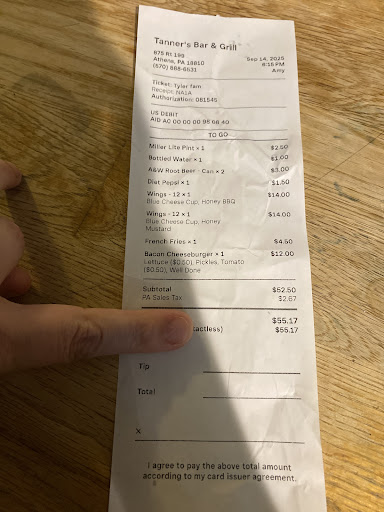 I should’ve walked away the moment they said they didn’t have high chairs. Sunday night so I get why I had to order and pick up everything from bar, drinks included. Got to go bc we have a toddler Bartender was rude, My words exactly for my order “Honey bbq wings, French fries, Honey mustard wings Burger well done, Asked what came on it, she said nothing unless you ask, didn’t mention up charge 1$ for lettuce and tomato. Also got charged for water when I asked for a cup of water, and got charged for the 2nd rootbeer, if I knew it cost I wouldn’t have gotten another. Got the to go order, my husband brought it out to me bc I was loading my toddler up, and they didn’t give us our fries. My husband went back in and said they forgot our side order of fries, bartender says it’s with the burger, husband asks that it doesn’t come with fries? She said no. Husband just left. I paid 4.50 for an up charge on a small order of fries. Very unpleased there. Got home and my husband starts eating and realizes they forgot the bacon. Extremely disappointed as the reviews were so good, Would love to be reached out to for them to correct. Receipt and burger without bacon pictures...