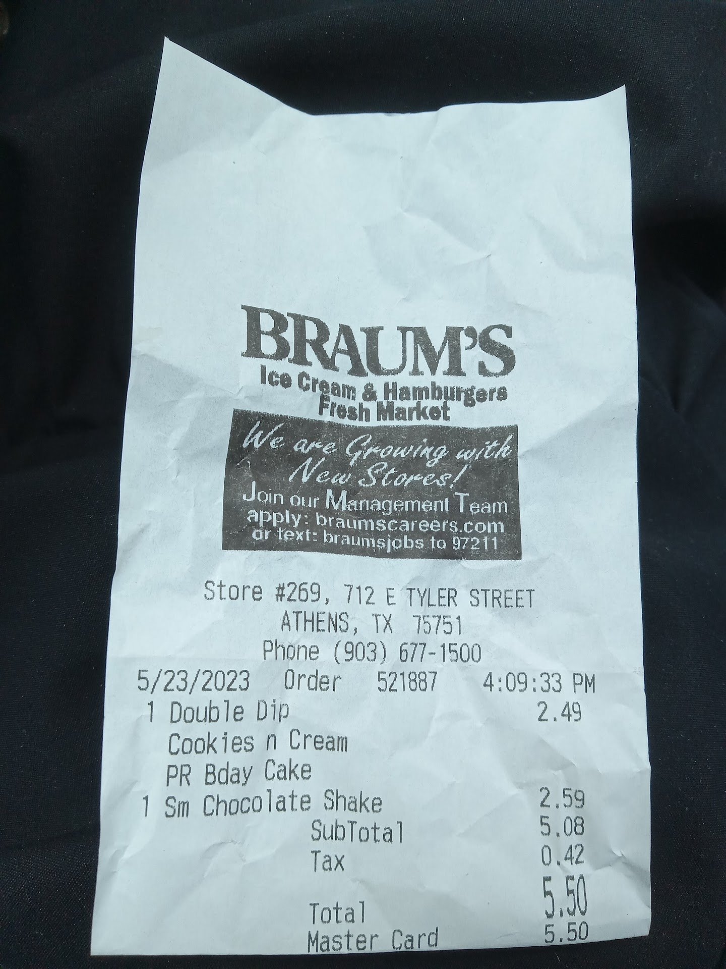 Read moreI have had Athens Braum's at least once a week for years. In the last 6 or 8 months I have been watching it go downhill fast! I went in tonight to get my dinner before work and as I'm paying at the window they weren't sure they had what I ordered in stock and took forever to find it. Then the lights went out having to wait for that. Get to the second window and got one extra thing I ordered but had to wait for the meals. A few min later, a young female came to the window very rude acting irritated with me..she looked at me like I did something wrong asking what i needed. I told her my two meals, and she rudely said to pull up to the corner..there I waited and waited then finally she comes out with my food, forgetting my braum's sauce...so it aggravated her to go get that.. I then get home and open a salad I would usually never get from there but really wanted a salad tonight, and it ended up with wilted brown lettuce all in it! This is the first bad review I've ever left Braums even after having a few other bad experiences lately!! I'M DONE with the cooked food there..will only shop the market and that's only if Ms. Ethel is checking me out!! DO...