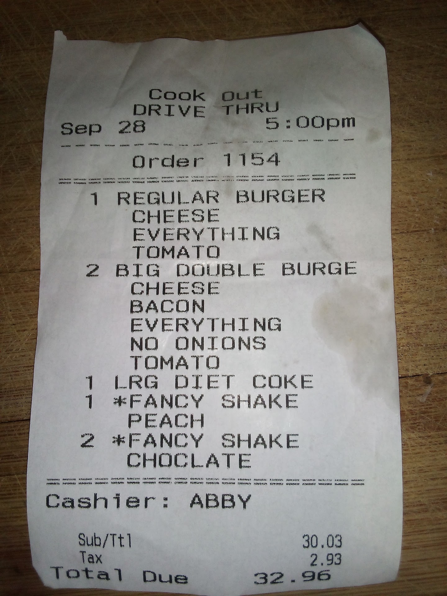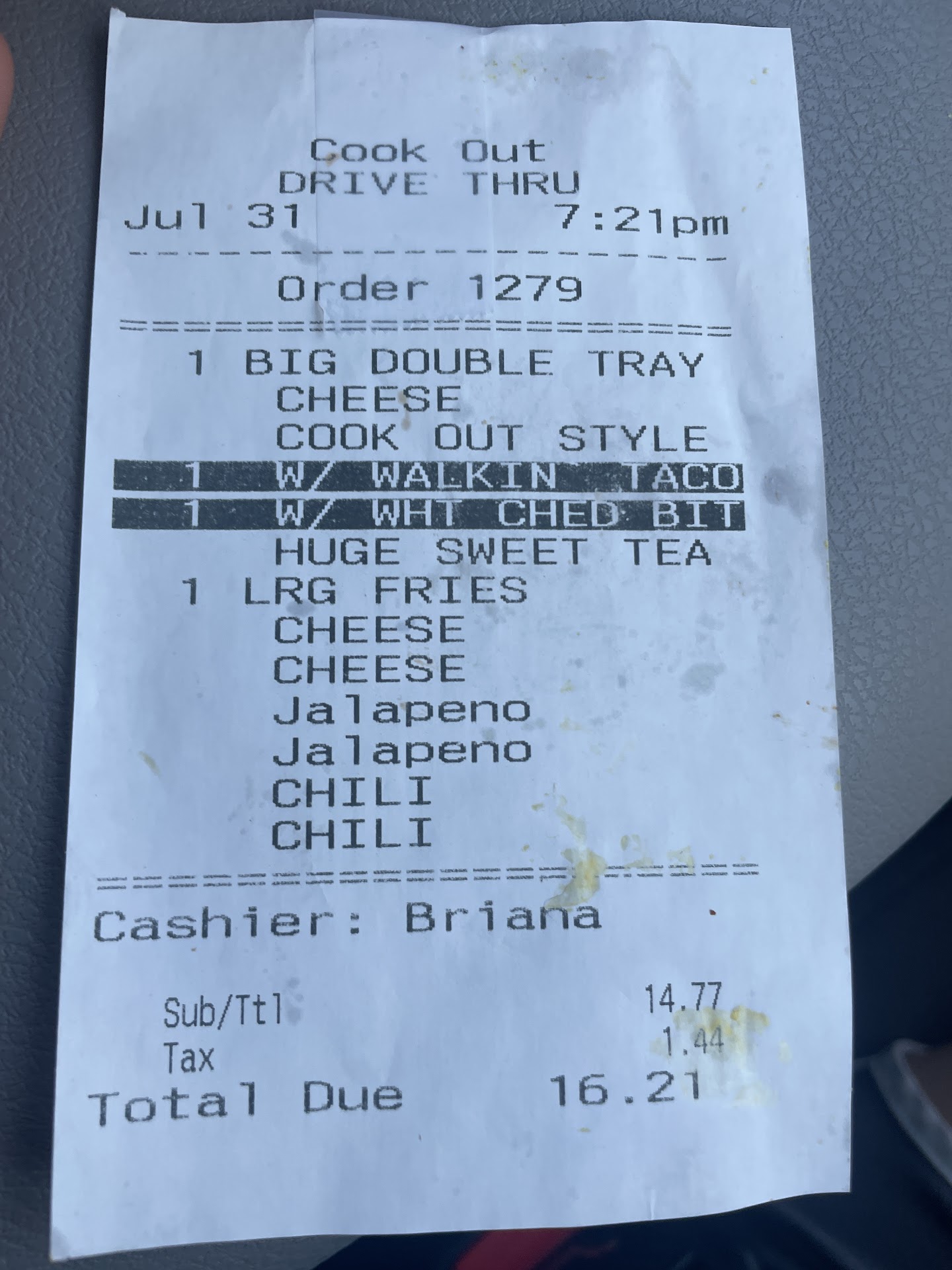 Read moreFirst time we ate there ah it was ok the hamburger meat was a little tough but we just thought it was cause it jyst opened up well we went for a second round omg I was so freaking ticked off well if this tells u any thing I put it in trash took one bite and the hamburger meat was burnt fries were cold the lady at the window was more worried about the lady out side than doing her job I don't know if the lady that was outside came in and fussed at them but the girl at the window said I'm not dealing with her u can and stood there talking to us like she knew us knowing our bag was sitting in front of her hello I wanted to say this is a drive thru this is where u hand our food to us hello but I wasn't going to stoop to her level they were all acting like 12 years old even the guy that was the manager I work in retail so I pay attention to alot people don't know but any ways we have not been back since and that was first of this year 2017 around about... And don't plan on going back I go to McDonald's even tho it's packed and poor little cook out is so empty it's really sad cause the one in Nashville when we stopped in...