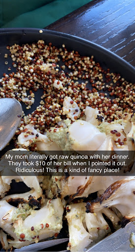 Ā Ā Ā Read moreNot impressed. Service was just ok - when we ate dinner our plates never got cleared away, even though we sat there for a good 10-15 minutes after finishing eating. As a former server this really bothered me. One dish that came with quinoa on the side actually came with UNCOOKED quinoa. (see photo) For a place that boasts an executive chef AND a sous chef that is absolutely unacceptable. We got a discount on our bill for that. (the server didn't even notice that it was raw quinoa, and when we pointed it out she seemed to have no idea what she was looking at - so weird). We also had the mac and cheese and it was by far the most bland I have ever tasted. Terrible. That being said I got roasted chicken and it was quite good.