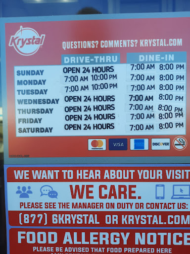 Read moreI usually come to this location every night, usually around 11:30 P.M on the way to pick up my bf from work, I always order the junkyard fries. Most of the time they are so cold the cheese doesn't even melt on them. The chili is cold like the warmer it sits on is off, the bacon is hard as if it has been sitting all day, and the fries are cold as ice. I love the fries during the times they are hot/fresh but it is a rare occasion that I get them hot. If i ask the employees on 3rd shirt to make the fries fresh they reply “they are” when they usually aren’t. It doesn’t take very much time to just drop a basket of fries and cook them for three mins, to satisfy a paying customer. Not to mention i stopped ordering krystal's burgers, bc they was grey and raw ordered a sackful one time just to throw then away haven't ordered them since. I am to the point of just not coming back to this location again. I don’t know who the manger is on night shift but they do not enforce the food safety for their customers for sure. I hope they passed servesafe because Whew they sure don’t use what they learned. The sign on the front window “served hot & fresh daily” is false advertisement for this location because it is never hot or fresh. The employees do not care about their job on night shift not one of them. The ones you might think does, I promise they don’t. Very disappointed in how bad this location has gotten over the years. I would love to see the owner turn this location around before...