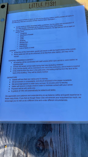 We visited Little Fish in Athens, Ohio because it is a favorite of my nephew who had just graduated from OU. It is a fun and eclectic atmosphere with good food, good beer and margs, and mostly good service. The reason I am writing this review is due to the host that was “welcoming” and responsible for seating guests. If I could give separate ratings I would. This host would have not even qualified for 1 star. My family went to Little Fish to celebrate my nephew’s graduation, there were 8 of us. When we arrived the host greeted us and asked how many in our party. We responded there were 8 people. He inquired if the entire party was present, we responded were waiting on the last 3 to arrive. He informed us that he couldn’t seat us until the entire party was there. In most restaurants this would make sense, but all the tables in this place are picnic tables which would adequately accommodate our party, so we wouldn’t be taking up any extra space. In addition, there were multiple tables with just parties of four. Plus we told this guy, the other 3 would be here in 5-10 minutes. He was adamant, we could not sit at a table until the entire party was present. (Even though we had 3 family members that were 80+). He curtly responded that we could sit on the patio and explained some crazy thing about scanning a bar code for drinks and snacks.So we assisted the grandparents out to the patio for awhile we waited for everyone to arrive. As we were looking at the menu that popped up via the QR code there were only bar snacks available. I went back in to inquire if that was all the food they offered, this rude host responded no, but it was all that was available on the patio. Ok, that was fine. I then asked if I could borrow a menu to show the group, of course not. This rude host dug his heels in once again and responded we have limited menus you need to go to our website. This was not some 20 year old college guy and you would think that he would have some customer service experience to realize that it is challenging for senior citizens to look at a menu on a phone. Seriously you couldn’t spare 1 menu for guests who were going to eat there? Nope. The rest of the party arrived in less than 10 minutes and we were seated. Our waiter was great and so was the food/drinks. But our encounter with the rude host was not over. He had the nerve to approach our table and ask if we would move, because they had a large party arrive and wanted to push to the two tables together. This guy is clueless. We were seated with our drinks with 3 people that have limited mobility and you want us to move, hell no. So, he instructed the staff to bring out two folding chairs to put on the ends of the other party’s table. He obviously is not aware of ADA compliance laws, because there was less than 12” between our table and the back of the other chair and this was w/o someone in it. We were ready for the check and our waiter was busy so I went up to the bar to inquire about getting it. Another, encounter with this rude host who interrupted my conversation with the person working behind the bar. He proceeded to explain everything is digital and on the waiter’s phone. This is ok, except once again one of the older adults in our party was paying the bill and wanted to review it. Again the rude host informed me, nope you can’t do that nor can it be printed until after you have paid. So an 85 year old is trying to read the bill on our waiter’s phone. We finally got the bill paid and a receipt printed. I would recommend this place, but this host needs to take some serious customer service and adaptability training. I forgot to mention they were not busy at all when we arrived, although they had started to get busy as we left. I also understand that this is a college town but this jerk was completely unprofessional and not accommodating to a party that spent a sizable amount. If this place hadn’t been a favorite of my nephew we...