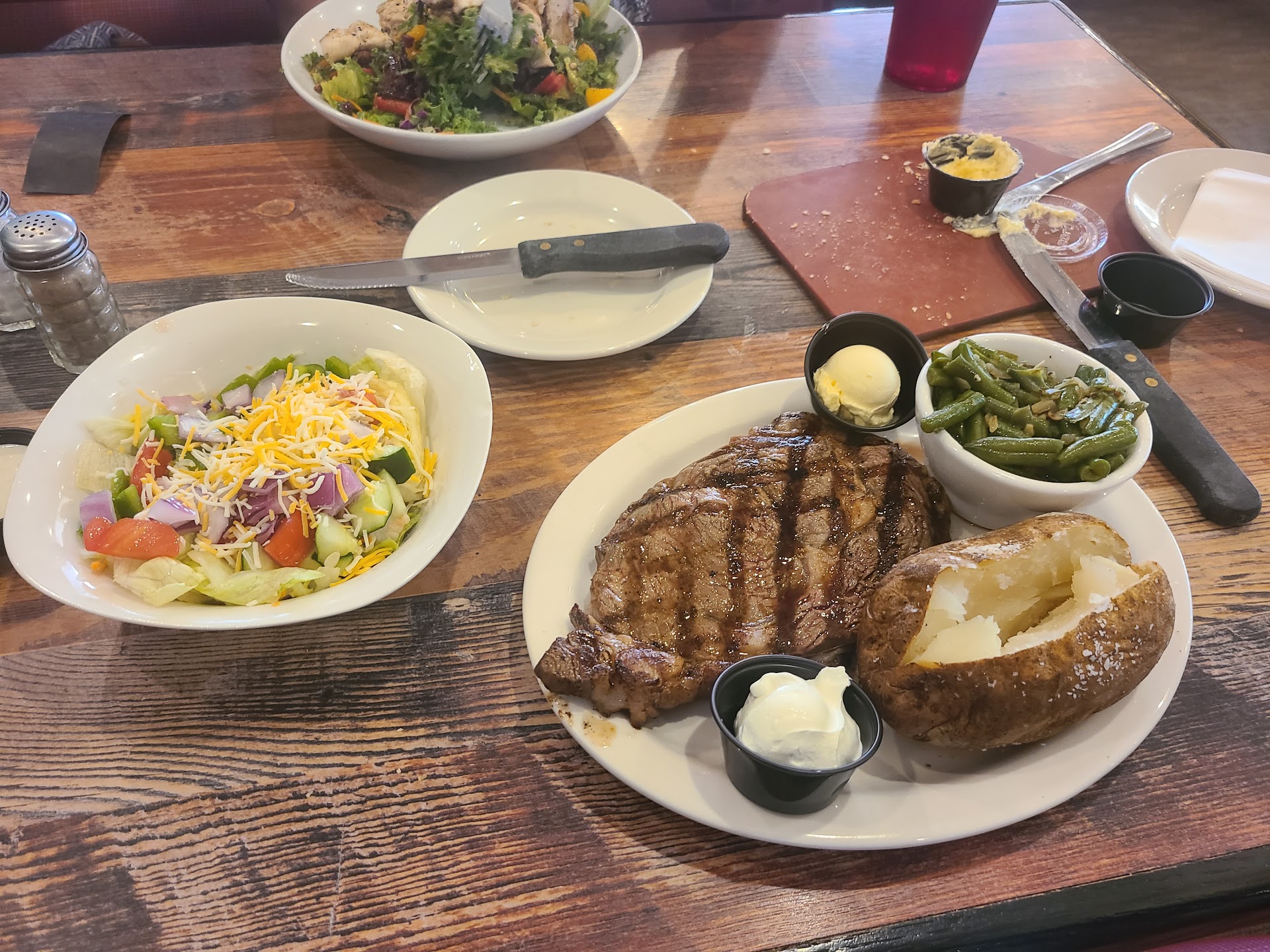 Read moreFirst time eating at this place. Easy access right off the main highway. Good amount of parking. Was greeted by hostess and waited about 10 minutes to get a table. This was on a Thursday night. So far so good. Upon being seated at the table, We waited a few minutes before the server, whom never introduced themselves, walked up to the table and asked for our drinks. Wife asked if they had Mountain Dew, the staff member scoffed and proceeded to inform my wife that they have neither Mountain Dew nor Mellow Yellow. That was the first sign this was gonna be quite the experience. As the wife and I waited for our drinks, we noticed a bread loaf at all the other tables, so we thought they may have like a appetizer bread of sorts. So after our drinks were brought to the table, the staff member asked a question but it was hard to understand what she had said. So I asked if they had bread, and the staff member, again, scoffed and stated that is what she just asked... So this young woman has now been just plain rude twice... So we get our food. Wife ordered a 12 oz ribeye it was $18. She said it tasted like it came from the dollar tree... I had their beef stroganoff and it was just plain bland. Not a lot of flavor. I will say the kids menu is suitably priced, don't think I saw anything over $6 on it. All In all, I think we will go back one more time, hoping to get seated in a different section, and try some different foods. Will give it one more shot. Only time will tell. Till next time......