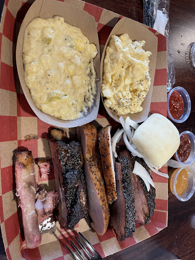 We had to try a little of everything. Brisket, sausage (spicey), pulled pork(too dry.. had to use a lot of sauce to eat. 3 sauces- spicy, regular, sweet Three different sides Non-macaroni & cheese..made with chickpeas. - very good! Best side. Coleslaw.. too much vinegar for us...1 bite was enough. Pinto beans were ok, but bland for us.. we tried 1 bite.. Drinks...