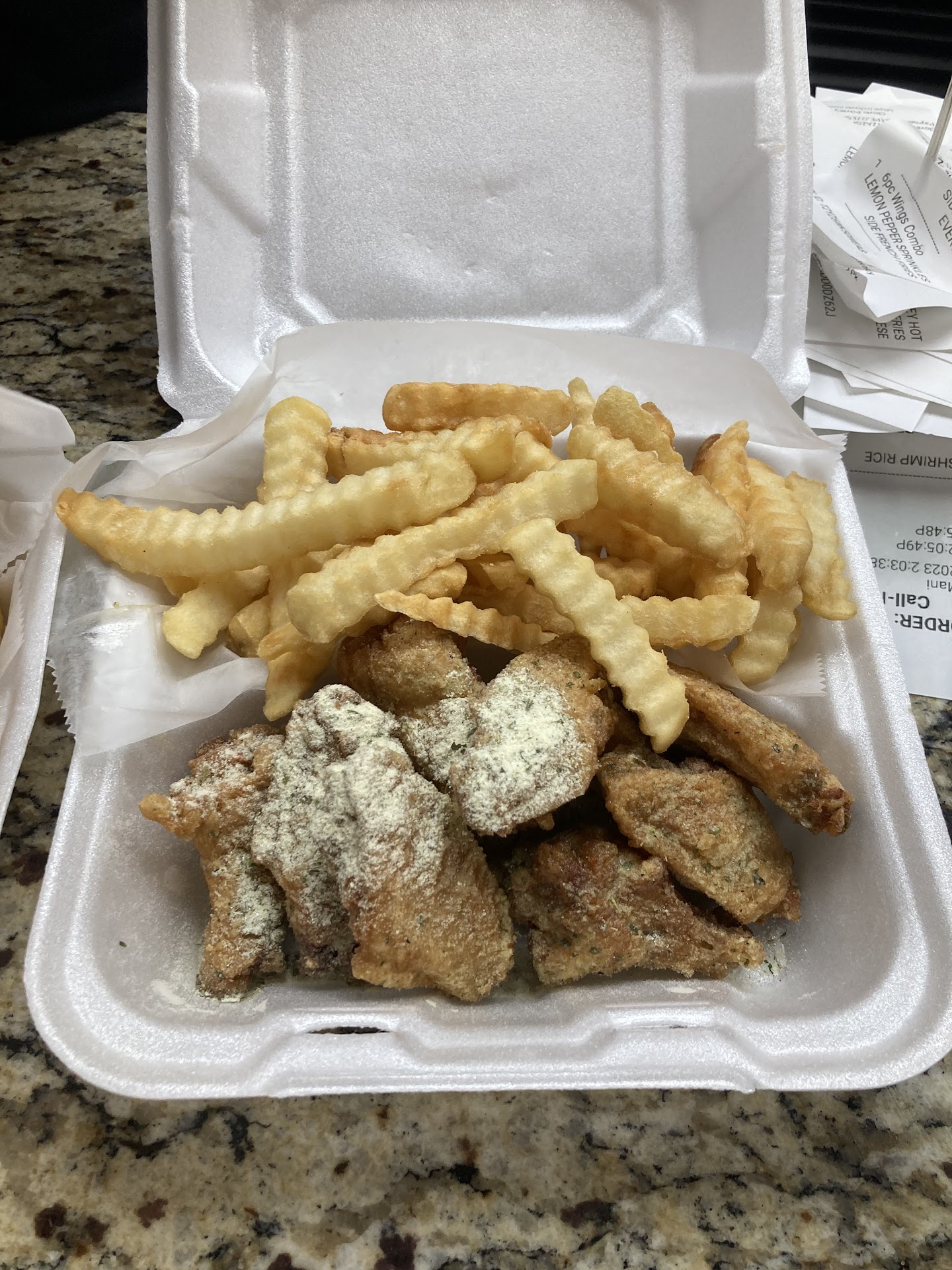Wings weren't crispy despite my request. Perhaps this flavorless chicken was BAKED instead. Smh The peach drink which is located behind the counter away from the carbonated drinks... Which is only overshadowed by the lack of peach taste. It's just sweet water. Then some random guy came in from the parking lot and immediately went behind the counter to the back where they were cooking. I hope and pray he didn't touch any food, but he made a drink for himself and left. The only positive is the fries. They were pretty good, but I guess you'd have to try really hard to make them bad. Definitely a waste of money and space. I endeavored to leave this review because I spent over $30 and it was largely inedible.