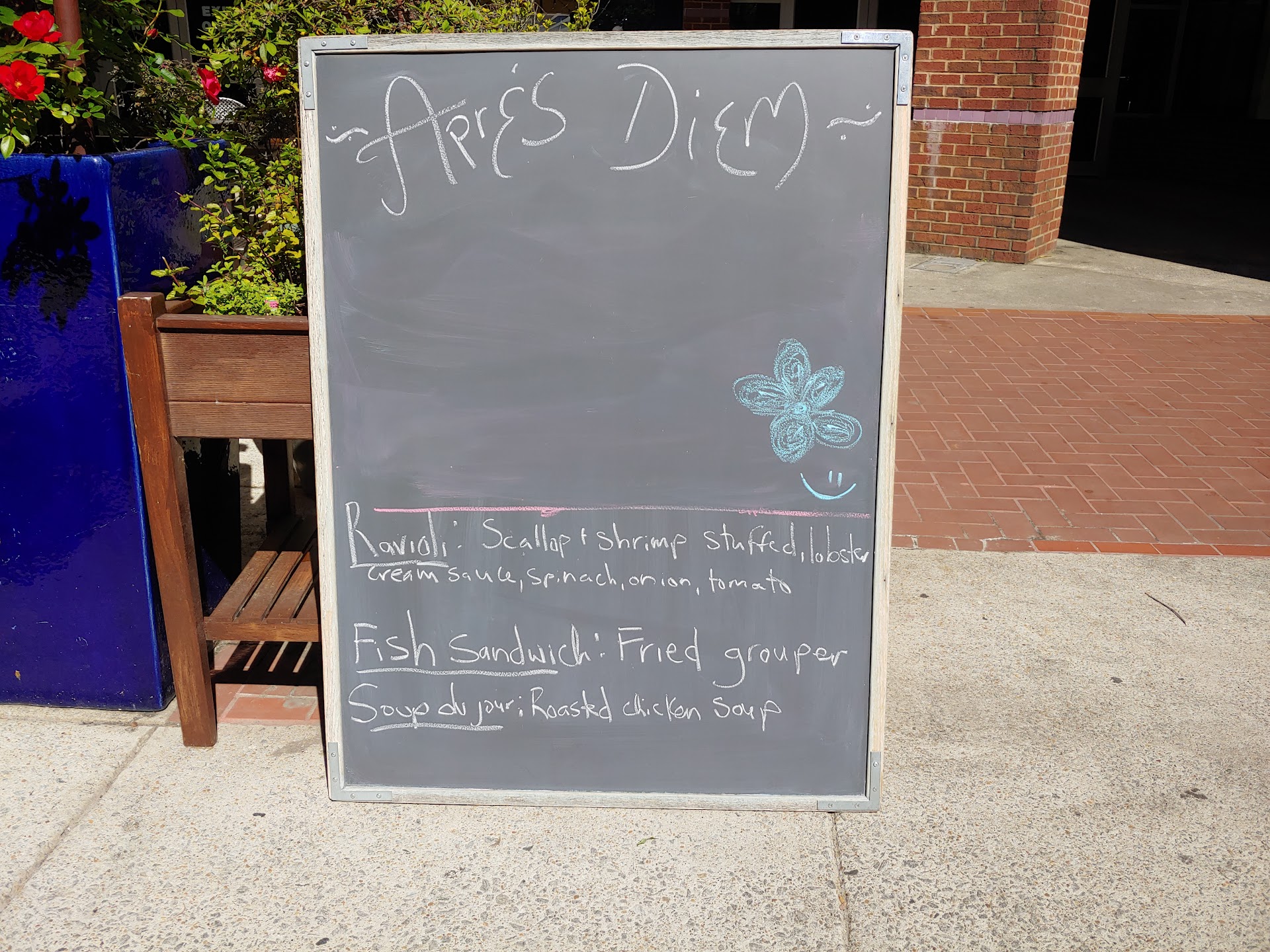Last Saturday (10/4/14) my friend and I decided to grab a bite before our 7:30 p.m movie. It was around 6:15 p.m. when we arrived at Apres Diem. We went straight to the launch area. All the spots seemed to be reserved, as they all had the little paper reserved sign. We asked one of the lady servers if there was anything available at the launch. She said that one of the spots was reserved for a party at 7:30 p.m. She said that we should have plenty of time and she didn't think there would be a problem for us to sit there as long as we were gone before 7:30 p.m. Fair enough.