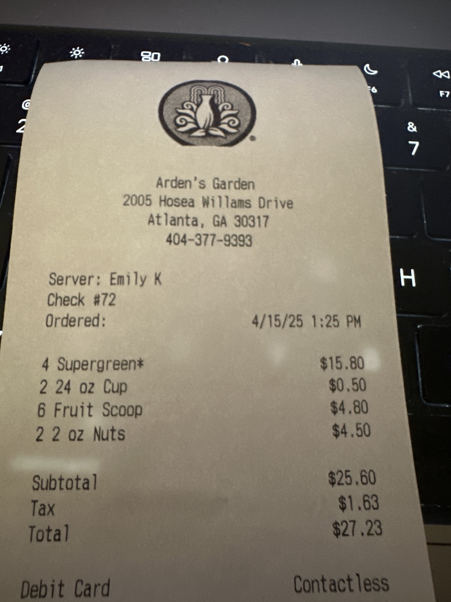 Read moreI usually go to this Arden’s Garden all the time because it’s close to my house. Today I went in and I purchased a cleanse ($30) , a grand slam 5.49 , and a smoothie for 5 dollars. Spent 47.00 and the smoothie that was made taste like chalk. I asked the guy behind the register if he could remake it because it was horrible. He said it couldn’t be exchanged when there is a sign that says you can exchange anything if your unhappy. His customer service was horrible I went back in with a tip for him but he won’t get that or my business ever again. His name is Antonio Canada.....Arden’s Garden do better the business on Marrietta Blvd has no problem switching out a smoothie. So stay consistent. Thanks...