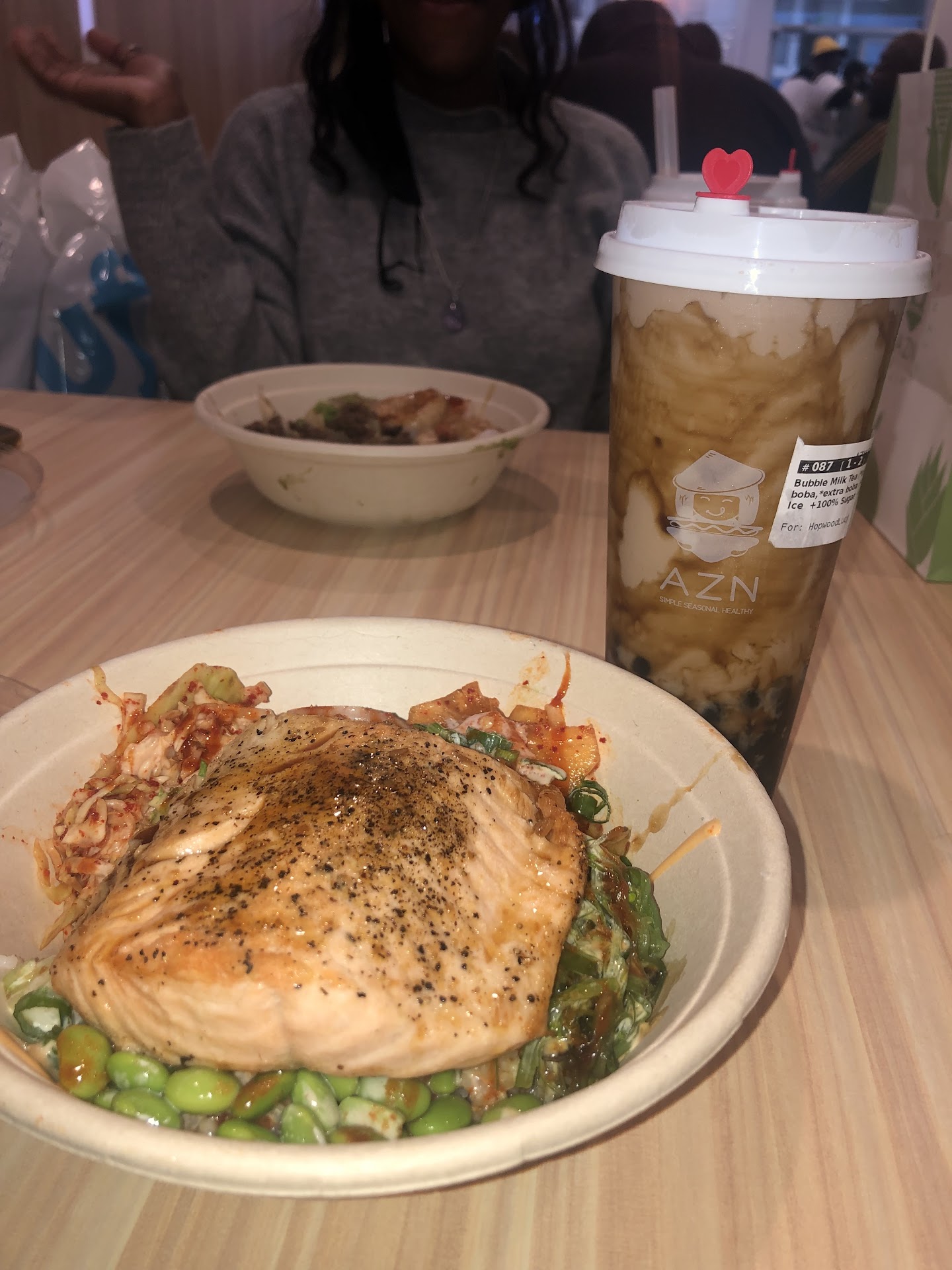 Read moreI heard rumors from a friend about boba on GSU campus and I was not disappointed. Came here today after class and found out they also do food. If you ever need somewhere to eat downtown, definitely come here! The food is healthy, fresh and seasoned amazingly! I had the Salmon rice bowl with toppings like kimchi and other sauces and I was surprised by the large portion size and the quality of the salmon. Its really hard to find good salmon downtown but they nailed it. It was freshly cooked to order. I also had the taro boba milk tea and I loved the flavor and simplicity. I got both of them for 20 dollars, with the salmon rice bowl being 13, which is way cheaper than other similar asian style places where they over charge for food that is subpar and not fresh. At the end of my meal with friends, the manager came over and asked us about what we liked and gave us free AZN keychains(which are super cute!). I love that they openly care about hearing back from their customers, unlike many places downtown that are tone deaf to the preferences of students when it comes to wanting affordable, healthy food. This place is definitely going to...