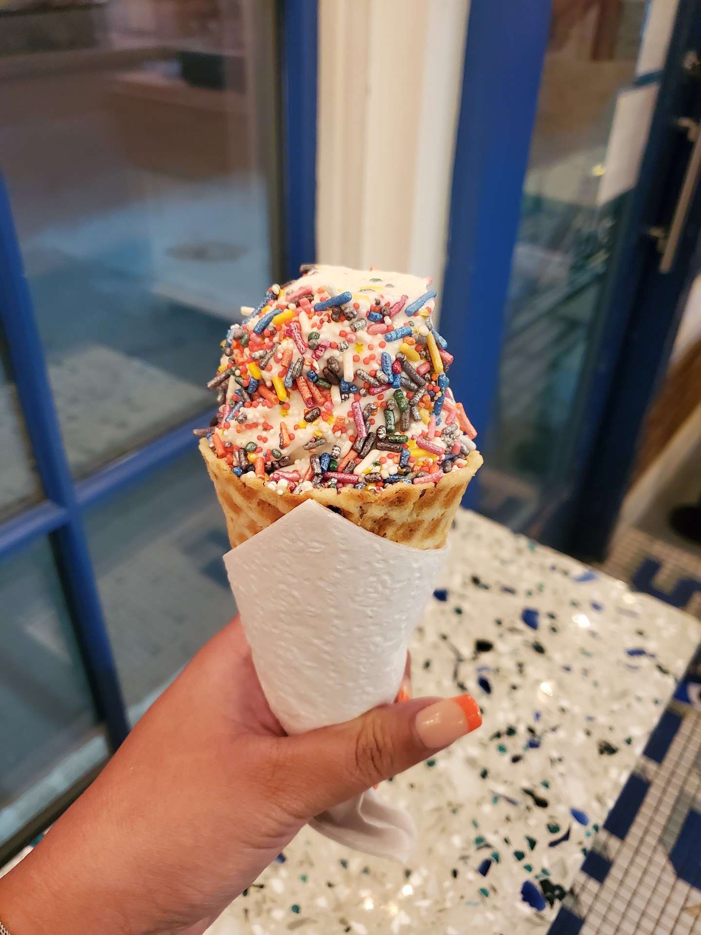 Once my order was ready, my name was called and my excitement started all over again. The ice cream was perfectly sculpted. It looked as if every sprinkle was perfectly placed and the ice cream to cone ratio was perfecttttttttttttttttttt.