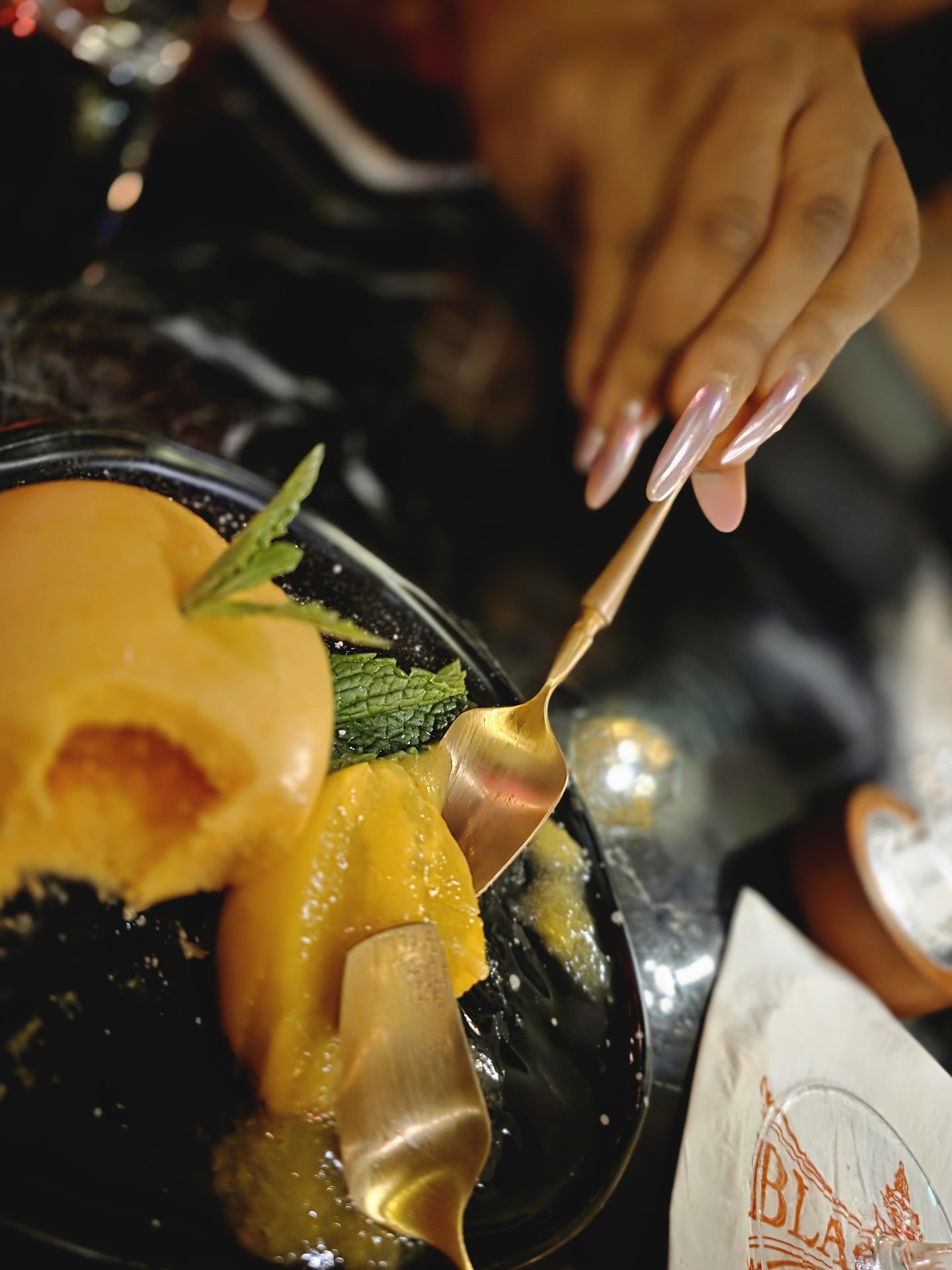 The ambiance is an Asian blend with the energy of a sophisticated nightlife lounge. It feels exclusive and incognito, the kind of place where the lighting is dim, the bar stretches long, and the mood invites you to lose track of time. Although we made reservations for a quiet table, we chose to sit in the center of the dining room, surrounded by everything from lively group outings to intimate couples enjoying the night. It felt like the right choice.