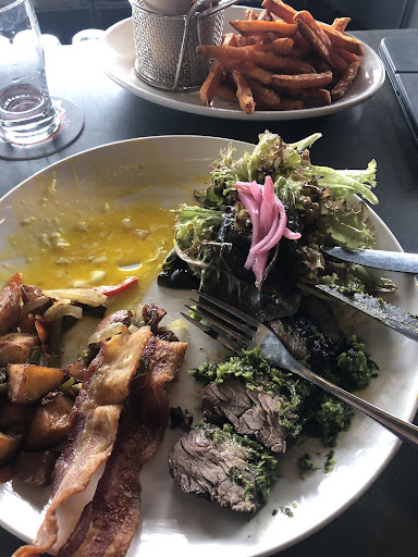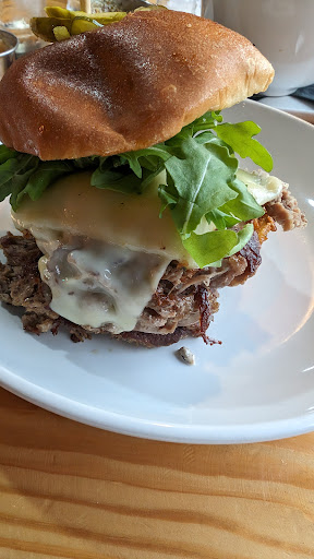 Read morePlace was nice and the staff was kind. Service was a little slow, the restaurant seemed empty for a Saturday but I'm not sure if that was just the time I went or what, so maybe they were short staffed. I didn't mind the service delay as I was there to talk with my friend. The pretzel bites appetizer was great and huge- even sharing it there was a lot. Recommend you get it for 3+ people, or if you want it as your meal. It's also vegetarian. My friend and I got sandwiches. Both had pickles skewered on top, I didn't remember seeing pickles on the description or I would have asked for it without them. My sandwich while good, was falling apart. I couldn't get one bite with everything. Meat read falling out upon arrival, sauce was on one side, so the other side was dry. The onion straws were very crunchy and good. There was a lot of arugula, and the cheese was nicely melted. I would suggest instead of a skewer that did nothing to hold my sandwich together, using a folded paper method and just putting pickles on the side of the plate. The paper would hold the sandwich together. My friend had the spicy sauce on his sandwich rocket out the hole in the bun (made from the skewer) and into his nose on the first bite. I got the cocktail that could be made with mezcal- which is my favorite spirit, and it was fantastic. So good. The restrooms are a little odd to get to, you have to walk down the line and out the back, which is fine, the problem being that the floor between the handoff window and the ice machine was slippery- like greasy slippery. I was fine but could see someone wiping out especially if they're a little drunk and trying to avoid the employees in that area. They need another rug there. As a side note you need to climb stairs to get to this place so if you have bad knees or are disabled you'll have to go to the downstairs bar. Their vegan and vegetarian options are limited, but at least...