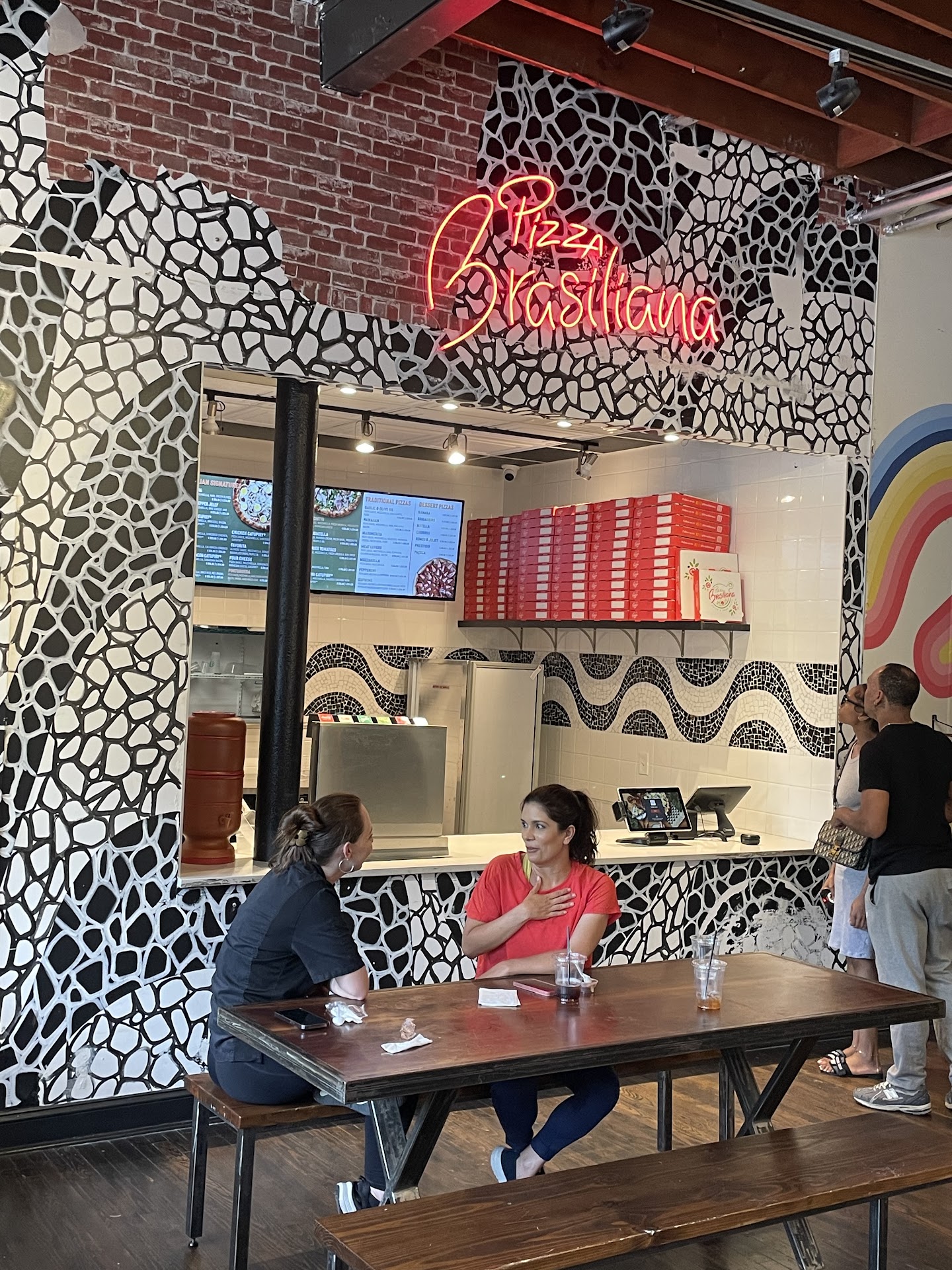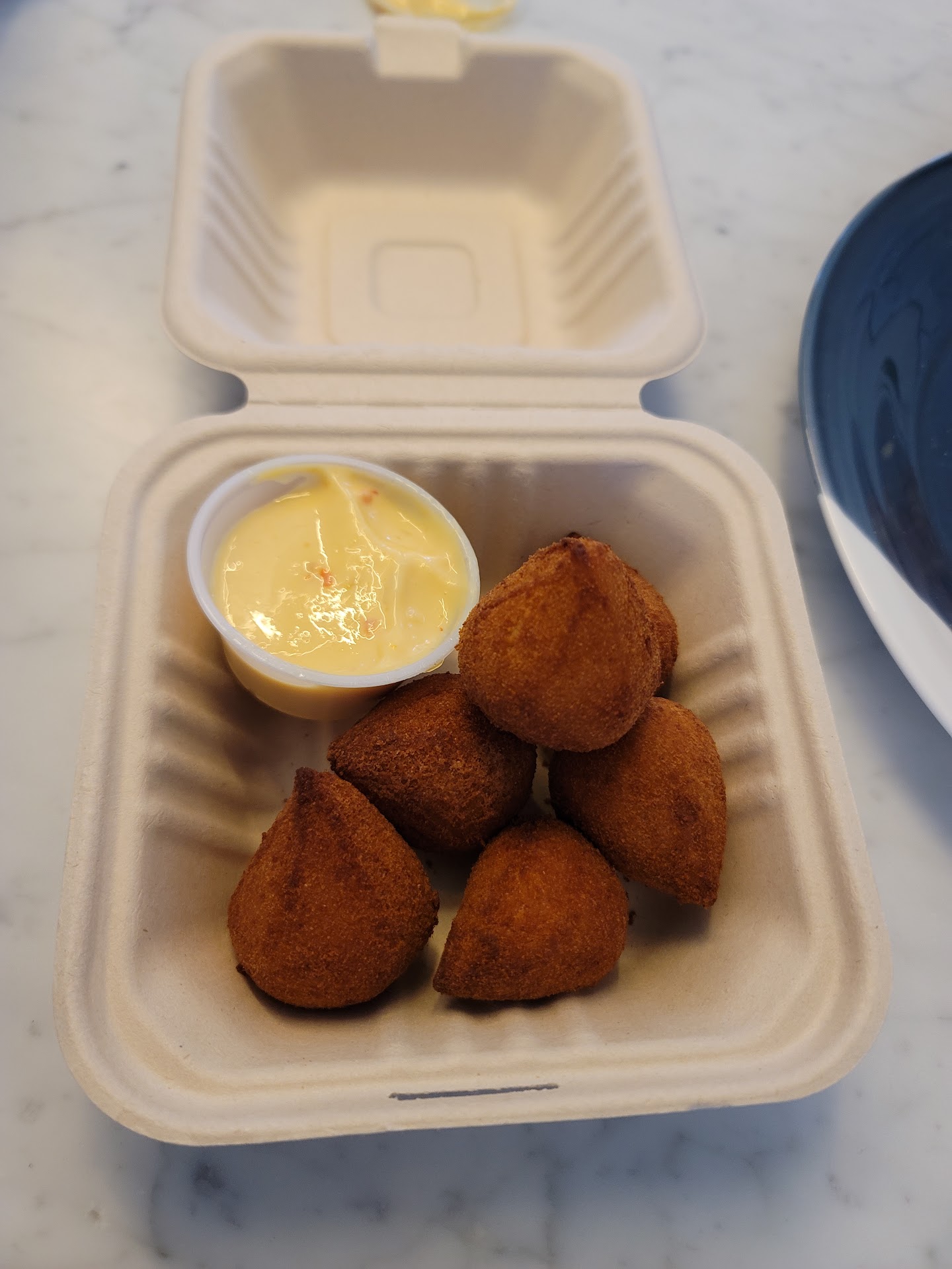 After ordering, we sauntered over to get a drink at the food hall bar (the drinks were amazing) and wait for our order. When the text came through letting me know our order was ready I walked over and was once again immediately greeted with a smile and my order given to me. As I walked back over to the table my wife had secured for us I noticed there was an additional box on top of our pizza. I thought to myself, “This must be some sauces or a treat on the house.” As I sat down with our order I opened the mysterious box to see it was an additional treat that we were not expecting…an order of coxinha’s! This is awesome! They’re giving us a gift! A few short moments later the smiling face that took our order shows up at our table with a pizza box and informs me, we were given the wrong order by mistake. Dang! She was so gracious, gave us our order and told us to keep what was originally given to us.