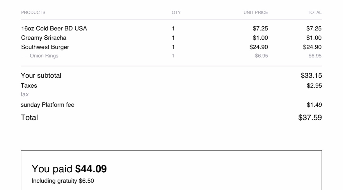 They have the app called Sunday but charge $1.49 just to pay your tab! Why not absorb into your pricing instead of customers feeling nickel and dimed for every last cent? As much as I wanted, I didn’t opt to reduce the tip because I think the waitress was helpless to this insanity.