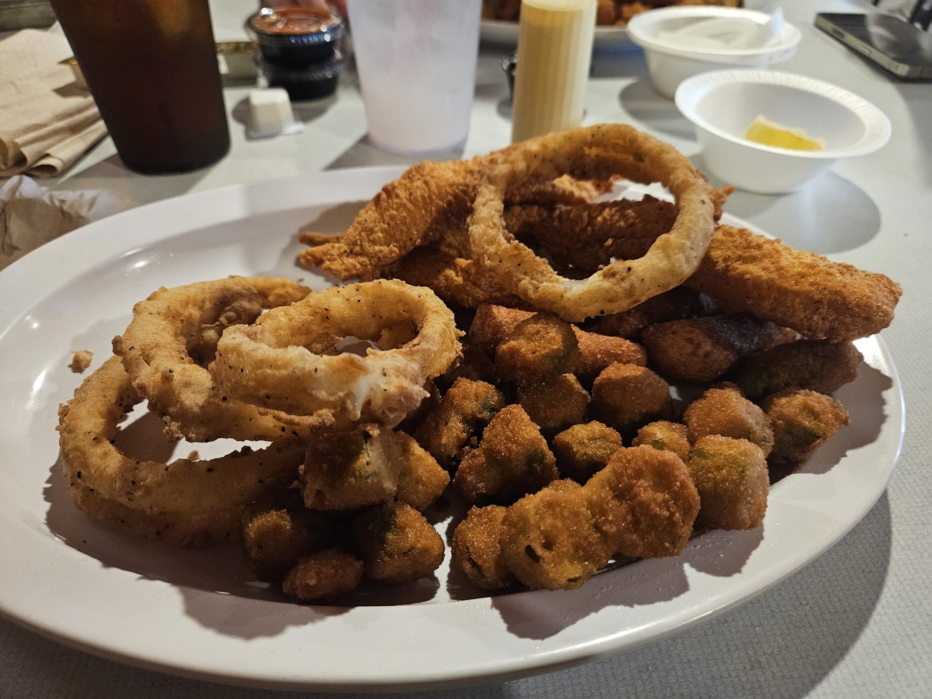 So we were just passing thru Atlanta tx. at 7:30pm on a Friday night which is 1 hour from our home and rarely do we pass thru here anymore. Sadly we don't have Catfish king in or around Longview tx anymore. They close at 8pm or in 30 minutes so that's kind of a thing to avoid in my rule book but we stopped anyways. The workers were very helpful and friendly. My wife and I both got 7 piece (regular not spicy) fried Catfish plates comes with 2 sides (we had fries & coleslaw) $16 each and an order of excellent onion rings. The picture I posted is the fish leftovers. As you can see the filets are big and they were prepared perfect. Nothing fancy just good ol Catfish in cornmeal batter. The way its supposed to be in my opinion. It was all excellent!