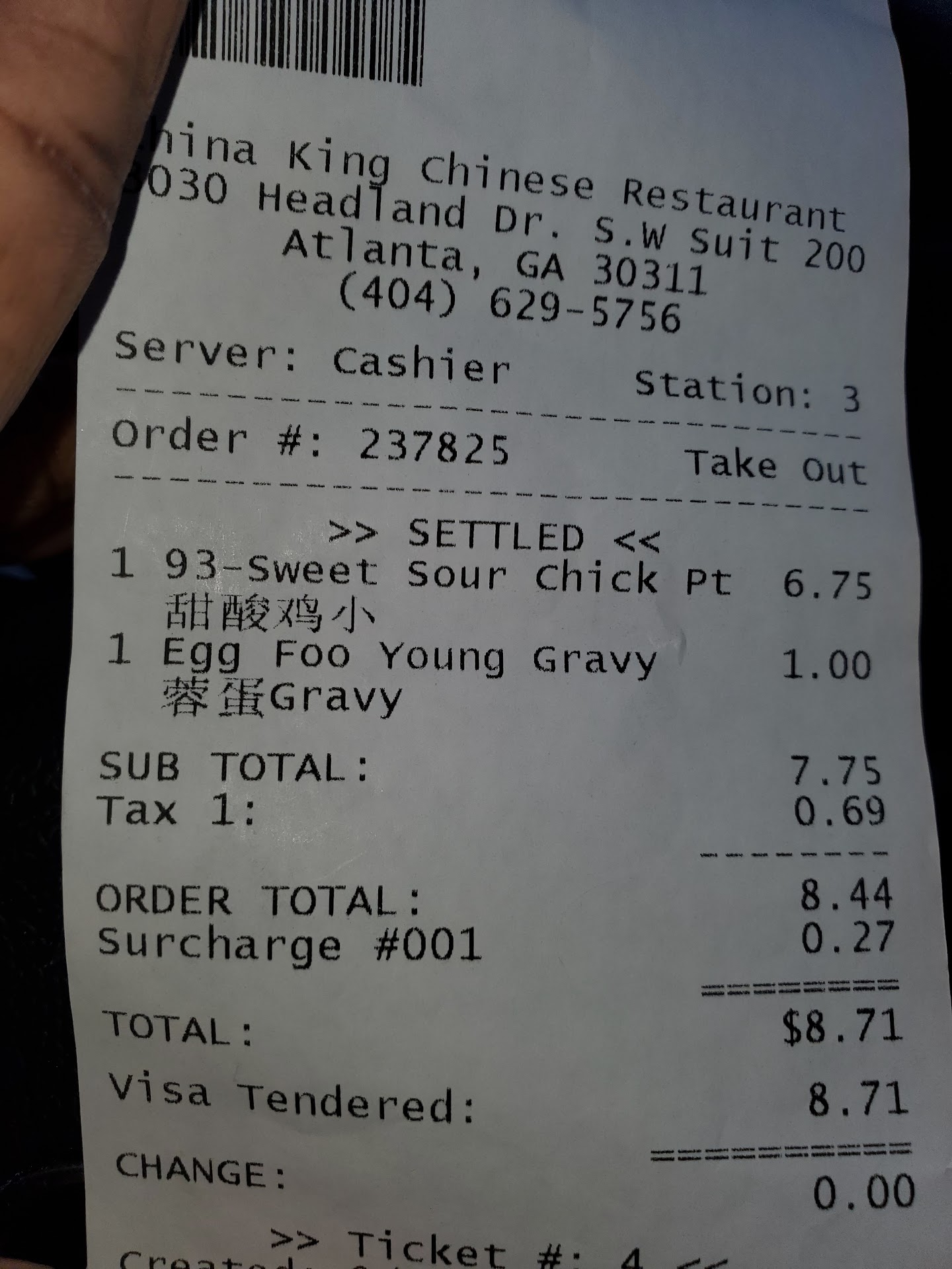 Ā Ā Ā Read moreSweet and sour chicken was great. There is a surcharge if using your card btw. She gave me my receipt. I noticed the taxes were off. She only gave me receipt to card machine. I asked for a detailed receipt. Then I noticed the charge. I asked her why she didn't tell me. She said it's on the wall. Rudely. I asked for a side of gravy. She asked what kind? I said brown. What other kind of gravy you have? She said we have other sauces. I said ma'am I didn't ask for sauce. Sweet and sour chicken was delicious š. But I'm not paying a Surcharge for using my card. It was over 5 dollars as merchants are not charged with a min purchase. Since I rarely carry cash. I will...