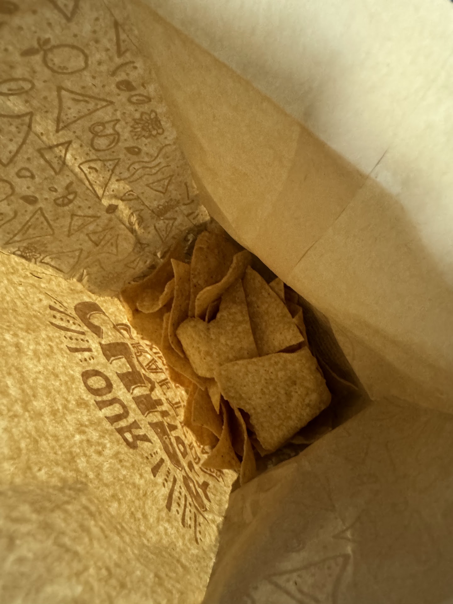 Then I got back to the hotel and realized the chips were only a handful in the bag. I ordered a large. Iâm not walking back over there and trying to explain this to them, but Iâm so frustrated. My flight was cancelled and I am stuck in a hotel so just wanted a good meal I could count on and...