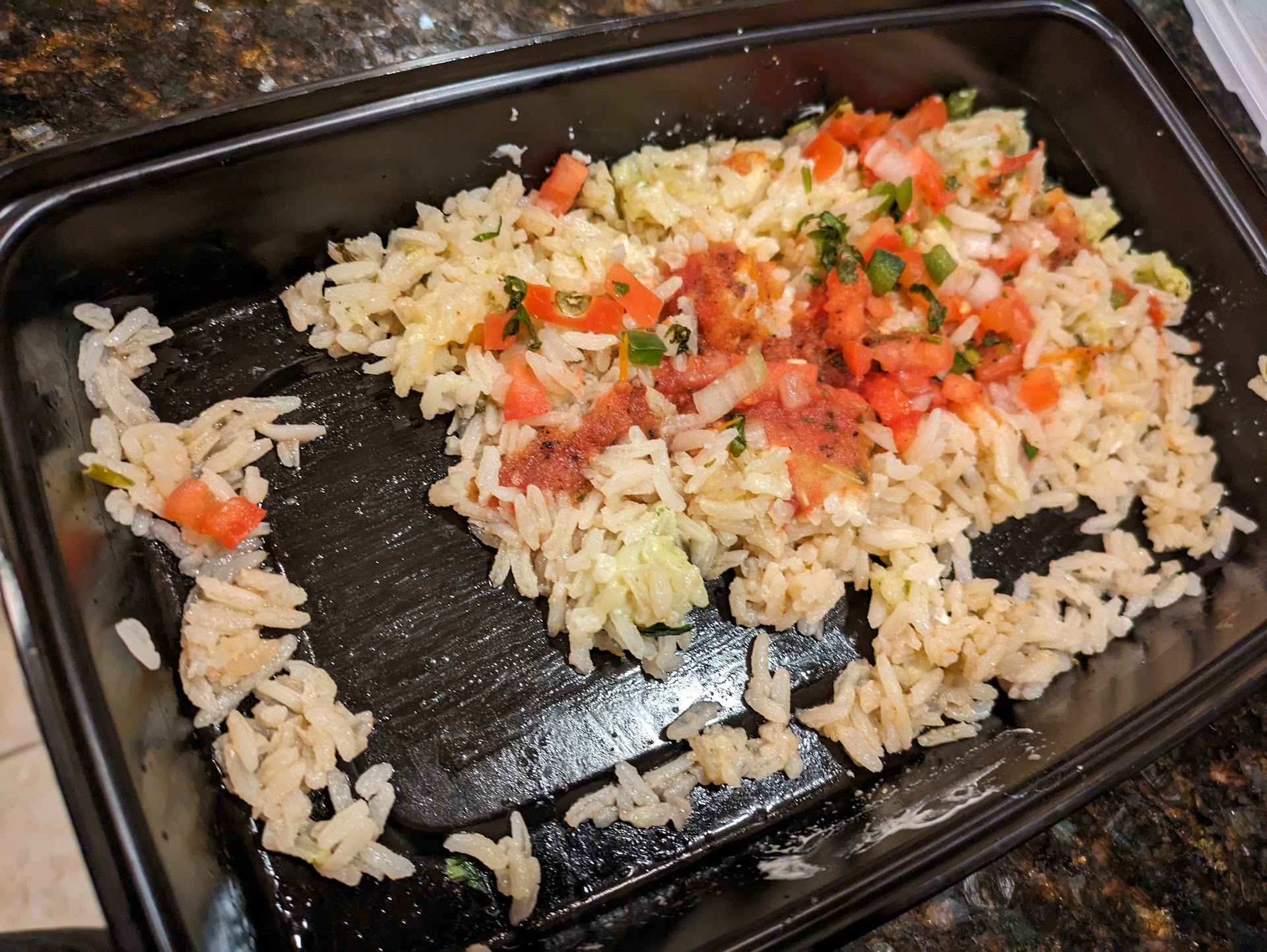 Rice tasted good, but it wasn't Mexican rice. It didn't have any seasoning, wasn't even the slightest hint of red, no chopped or stewed tomatoes, nothing. It was more like 90-second rice from the grocery store but very watery and mushy, so the texture was kind of icky.