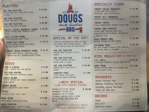 Read moreDoug's NC BBQ is a must-visit destination for any BBQ enthusiast! The macaroni and cheese was a highlight, with a creamy, cheesy goodness that will leave you wanting more. But the real showstopper was the ribs - they were fall-off-the-bone tender and full of flavor. The location is also a winner, with a welcoming atmosphere that's perfect for families with kids. And the fact that it's connected to other shops and stores is a great bonus. Plus, the 2-hour free parking is a huge plus. My only complaint is that it was closed when I visited yesterday, but I'm eager to go back and try more of their delicious offerings. Overall, I highly recommend Doug's NC BBQ to anyone looking for a top-notch dining...