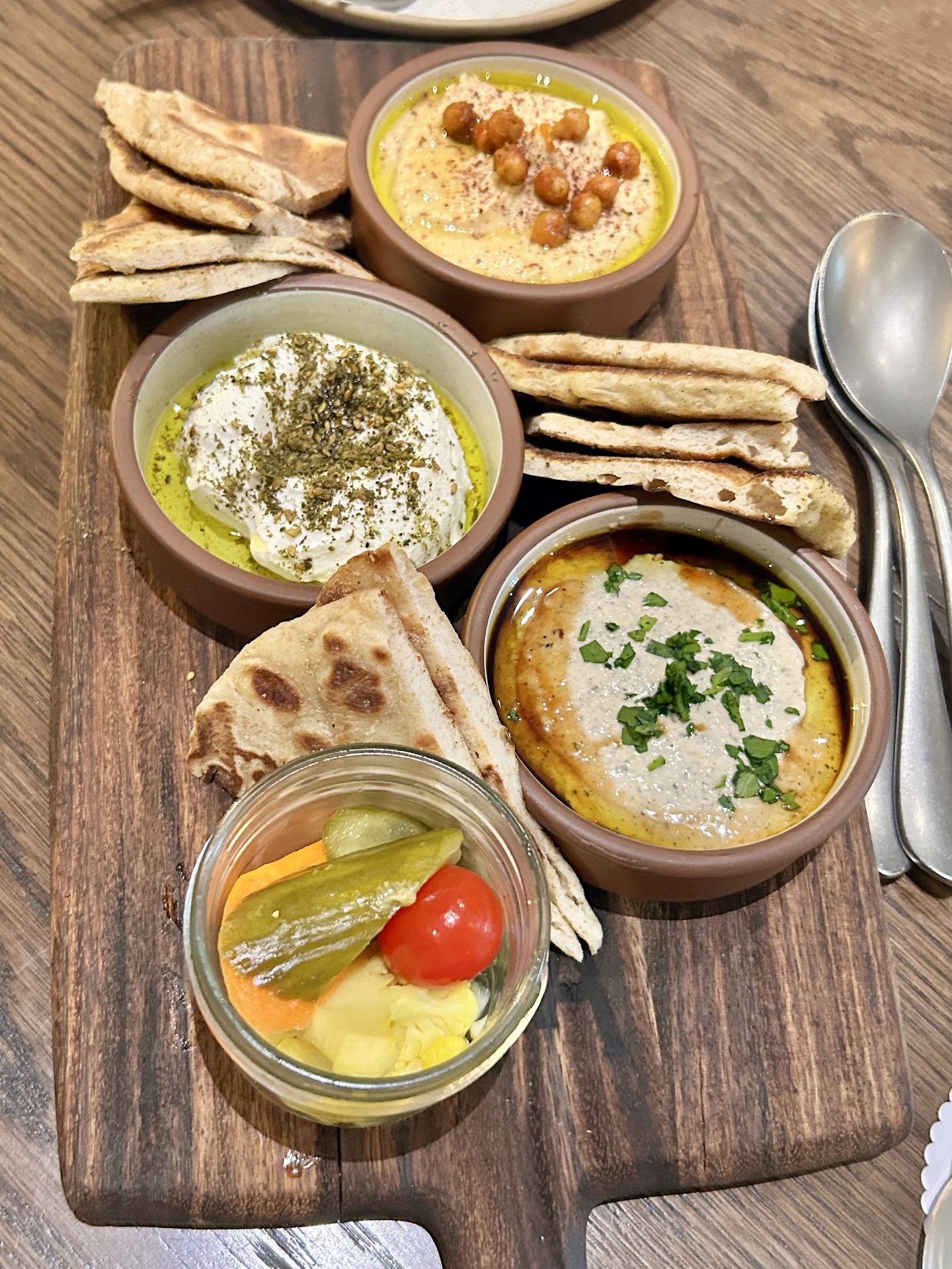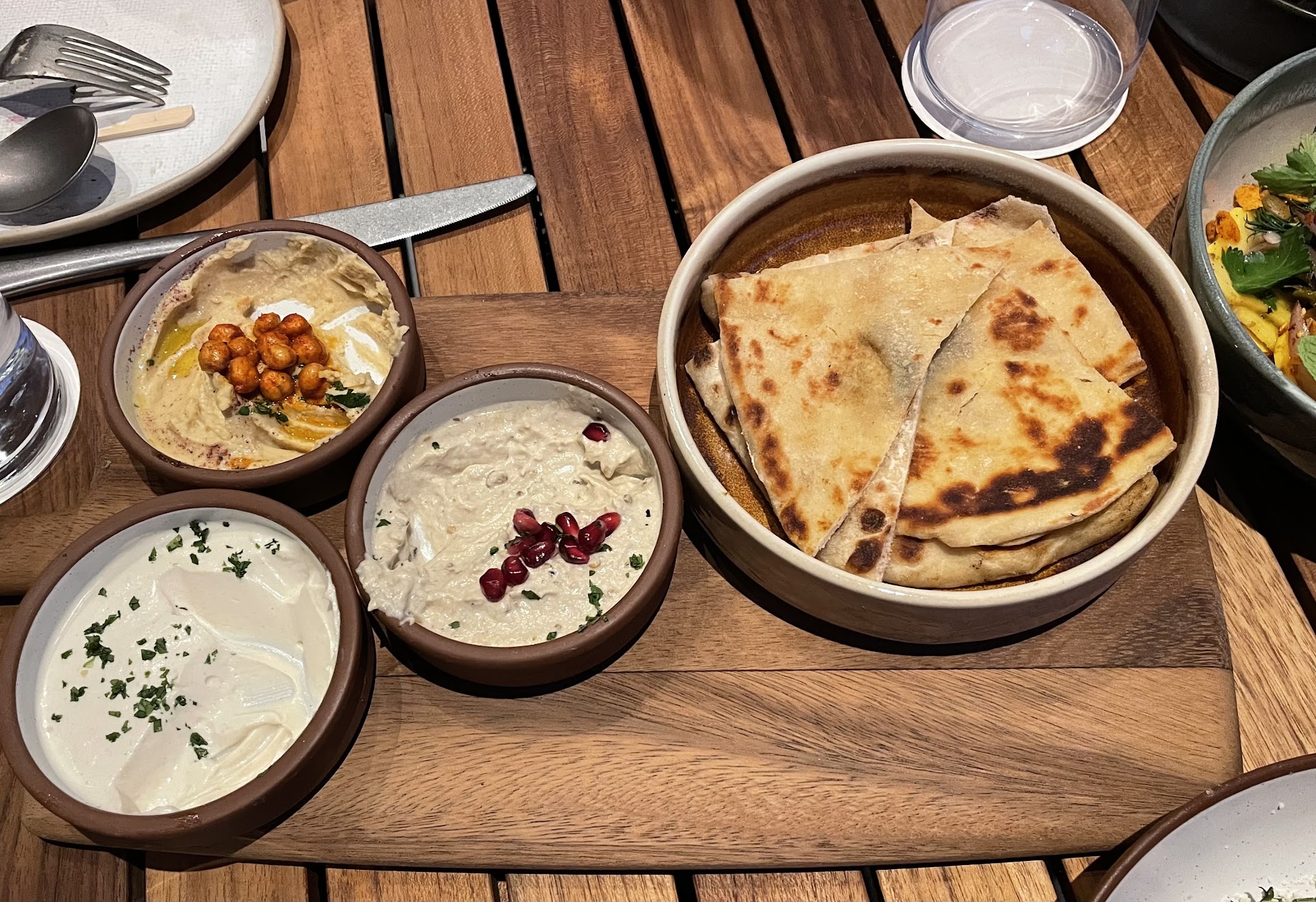 Hummus Trio was tasty with pita bread. The chickpea option was a lil salty but I didn’t realize I was to mix them in and the flavor evens out. The other two are delicious. Kinda thin Hummus but great in their respective bowls. Always great service here.