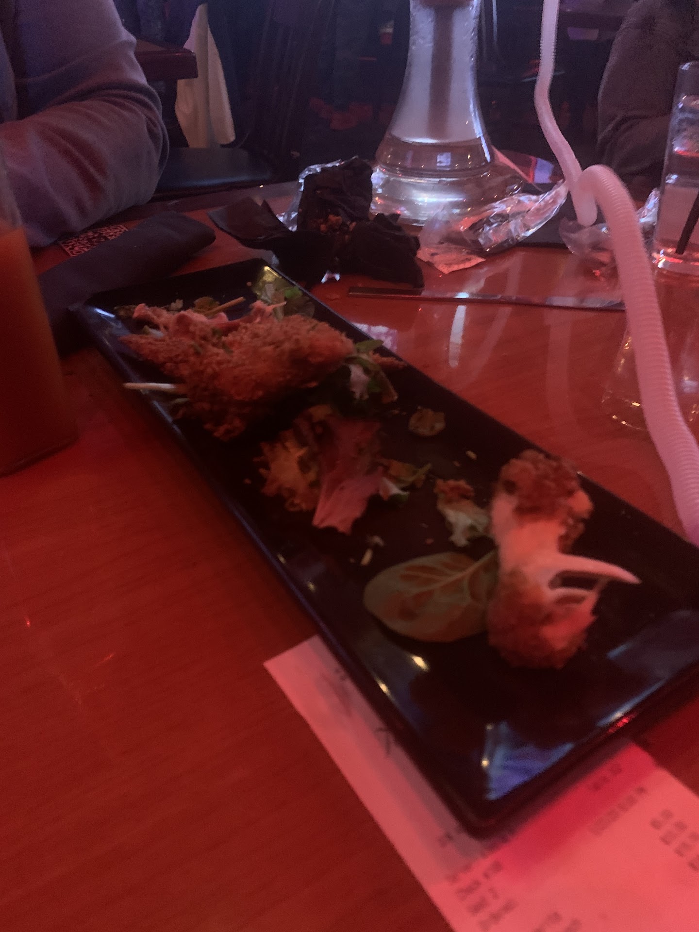 One friend got a hookah. They said it wasn’t good at first. The staff left and brought it back. My friend said it was better then. My friend ordered egg rolls and fries. The fries were hot and tasty. The egg rolls appeared old and non appealing. They said it wasn’t good but they ate it because they were hungry.