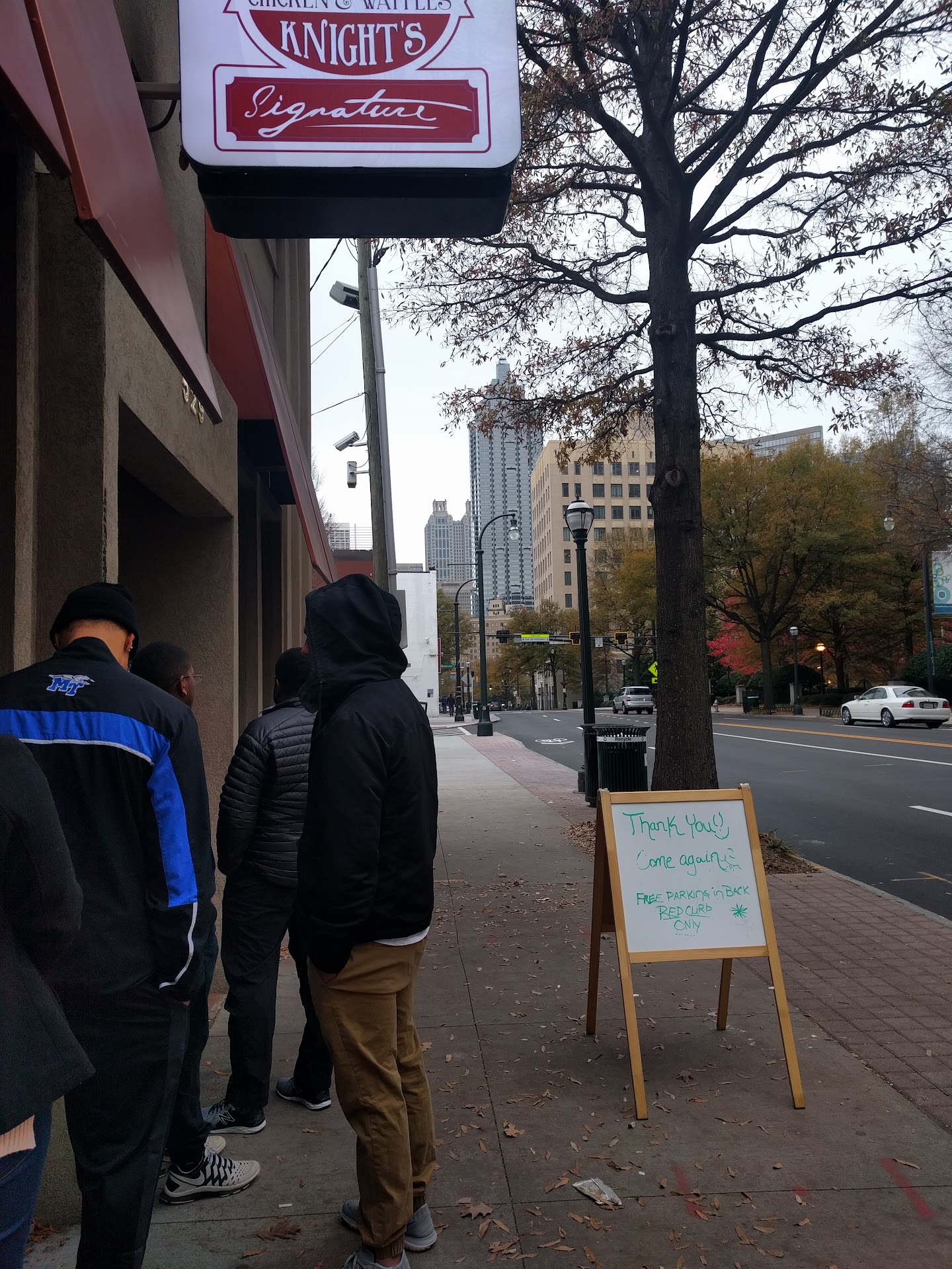 Wait time: After we snaked our way through the large group of people waiting to get a seat, in order to put our name on the list, a guy came in to place a to-go order and I overheard him tell another guy that on Sundays, the way to go is "to-go" since the wait time is ridiculous on that day. I'm not sure about others' experience(s) but our wait time was maybe a total of an hour real-time, instead of the 45 mins. the hostess mentioned. For us, that's a cake-walk compared to some places we've tried both in Atlanta, and even in Birmingham (i.e., 90-min+ wait). So - a non-issue IMO, especially considering how much worse it could be for a very touristy spot... in Atlanta no less. We stood outside and waited as a server/hostess would come out every few minutes to call the next group in to be seated.