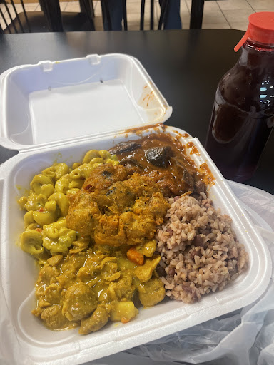 So when you walk in there's a hot food case with items to choose from and they also have special items in the back so make sure you ask. Pick up a food tray from below if you're thinking in. There's a white board with a handwritten menu with prices by the register and another menu with the unmeat items in the dining area. The server allowed me to sample a few items which I was very appreciative of; I ordered a medium plate with curry ungoat, mac n cheese, cabbage and a side of the fish cakes. *medium plate with "meat" and 2 sides $9.99 (i believe) side fish cakes (2 per order) $3 alkaline water $2 I was surprised by the portions, they were very large. I dined in so the items were on a plate. There's four medium size low tables in the restaurant and about 3 small high top tables. They also have a sofa for sitting.