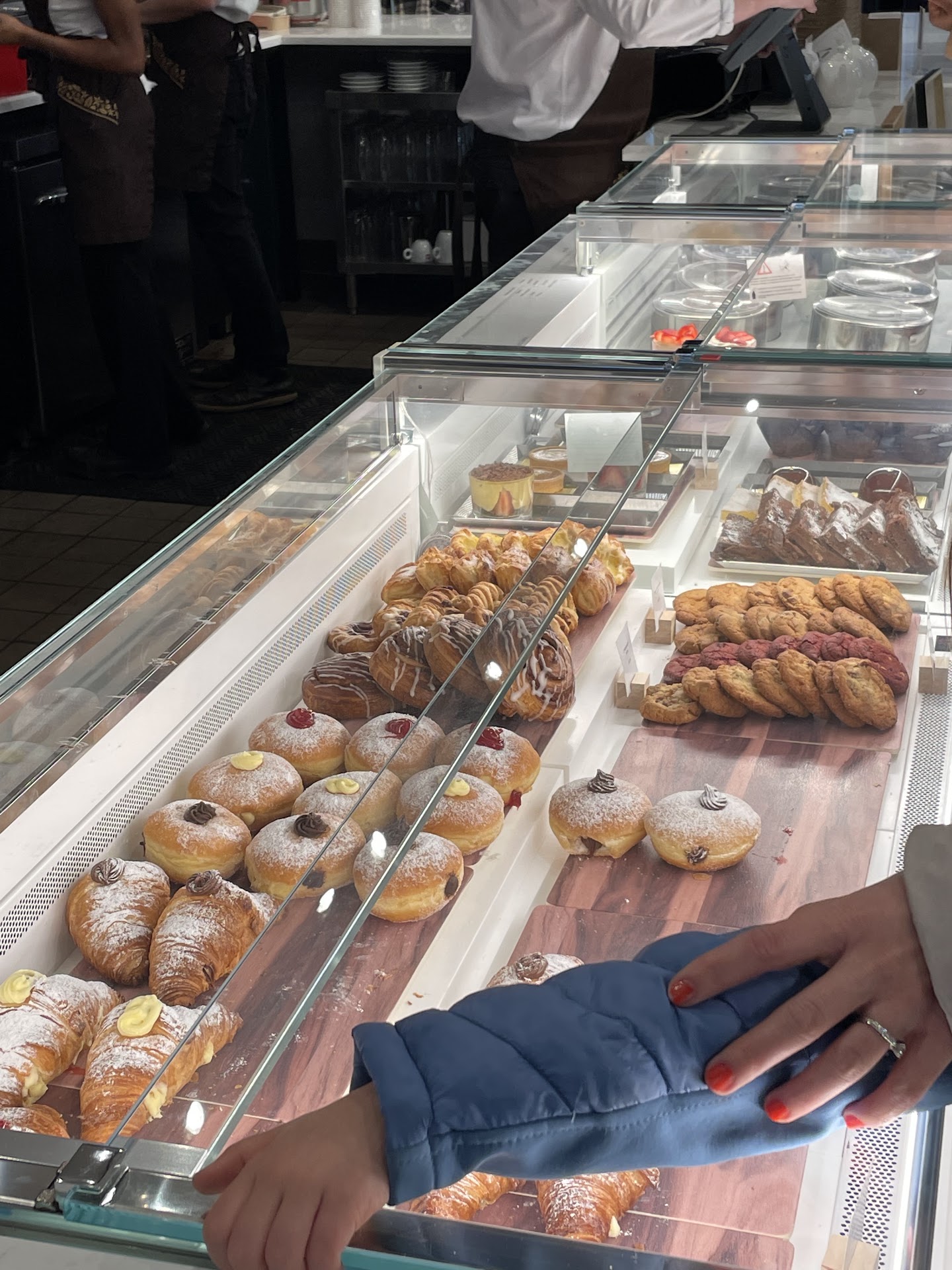 If you like your espresso beverages on the more milky side like I do, you will really enjoy the drinks here. The coffee is on the lighter side. Very nice variety of pastries and lunch food. Prices were reasonable, especially for the lunch food. I didn't get to try any of the lunch food but I would definitely try it next time. The Nutella Croissant I got was spot on and perfect with my coffee. The line was long that day, but the workers seemed joyful and happy to be there, and we were greeted with cheer despite the crowd! My mother wanted more coffee to top off her cup and we were able to get it topped off with no issues despite how busy it was.