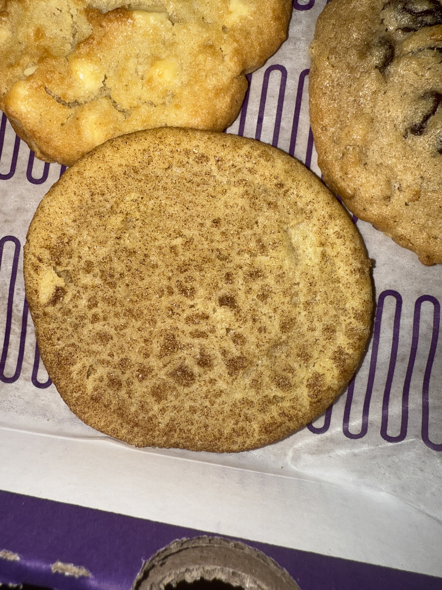 I ordered the Snickerdoodle, White Chocolate Macadamia, and an Oatmeal Raisin. Once my order was placed, my cookies were in the box and presented to me before I was even done paying. Thatâs what you call service!!!!