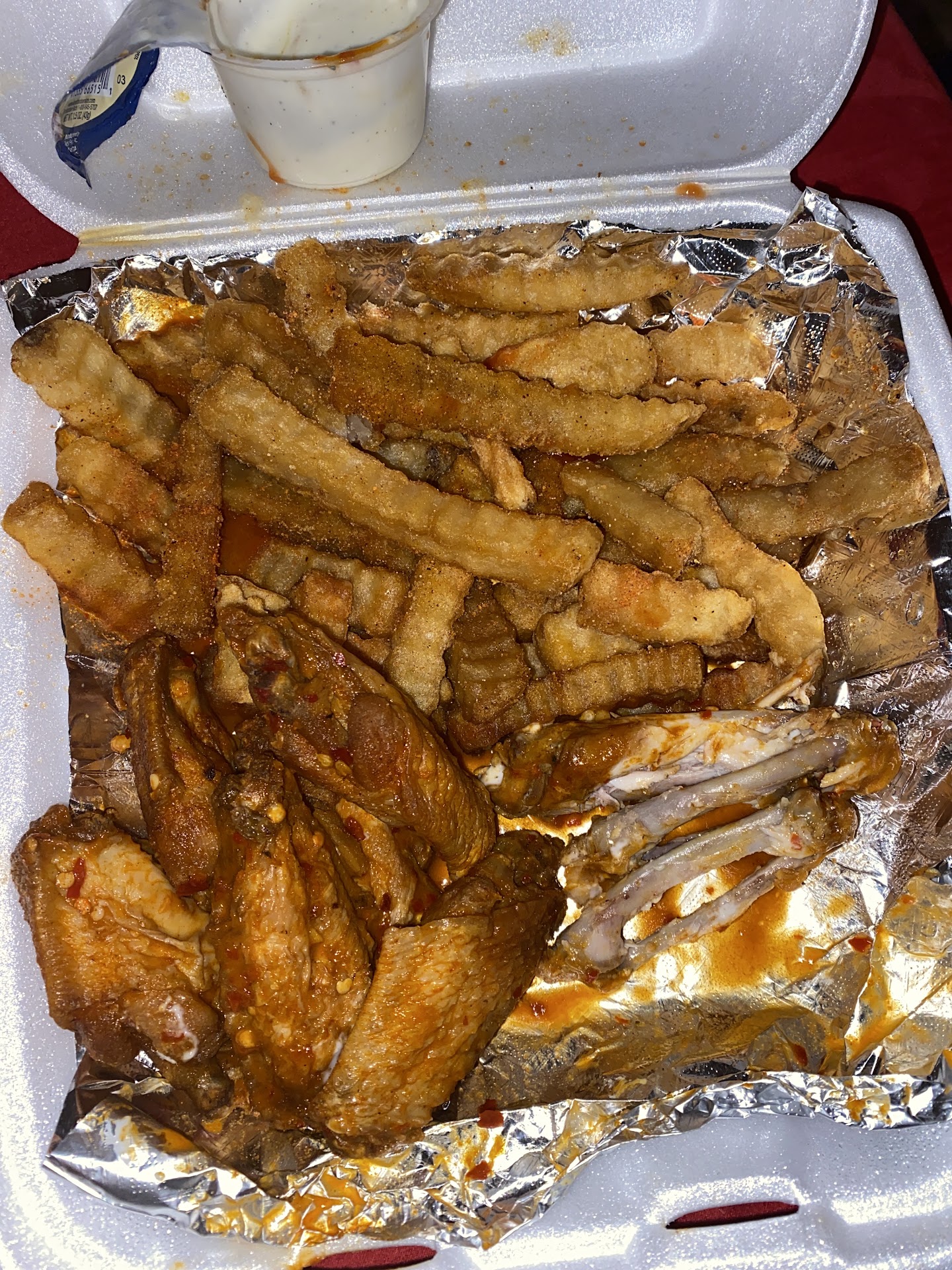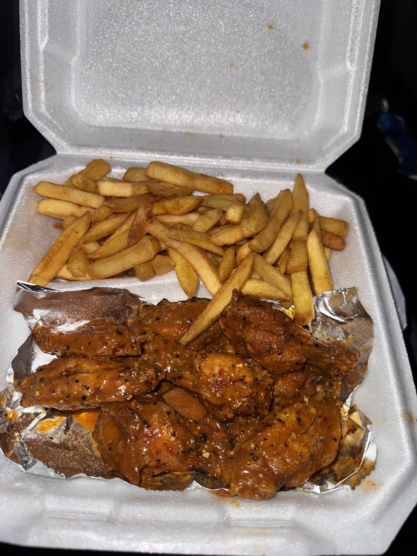Read moreI've never actually been to this establishment, nor had I heard of it until the very moment it was mentioned as a choice. I was hungry at 9pm on a Saturday. My boyfriend ordered me a meal from here since it was one of the few places that I could get food from that late in my area via UberEats. It isn't even near me but cool, the driver came a ways. It took a little over half an hour to be prepared and then it was picked up by the driver. The food had a really weird smell before I even took it out of the bag but it subsided when I actually opened the Styrofoam plate. Points for it being hot. The fries were great, not crispy which I like. They were well seasoned and 'tender'. That's an odd way to describe fries but that's how they ate. I'm use to bland, hard as rock fries from most places. The chicken however, was not so great. That's what prompted me to write this review. 10 lemon peppered wings. They were extremely too salty, terribly overcooked and dry as sandpaper. I couldn't really eat the last 4 of them. It was disappointing. I didn't even complain to my boyfriend because he'd call me an ungrateful brat. LOL. I should've opted for the pizza but we thought chicken was...