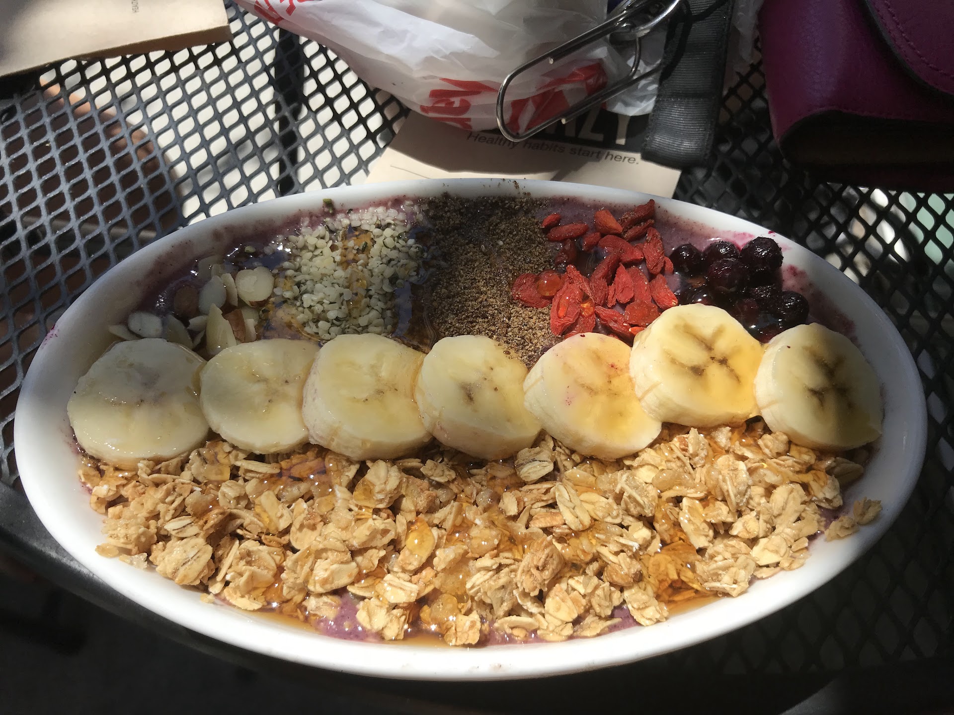 Read moreI got 8 cute little slices of banana with a light amount of granola. I understand it’s “health” food but it’s a quite disappointing when compared to açaí bowls of the same price from other establishments. I tried asking the crew member who held me about the extra topping I ordered & so since no one was in the front I said hello, waited, & then said hello about 4 more times before she came.. apparently it was understood to also blend the topping into the base. I understand it’s a smoothie bowl but I ordered an add on fruit for an extra topping.. some people actually like toppings but this didn’t leave a dent in my stomach, just my pocket. I understand the concept of a smoothie bowl but this was practically just a smoothie I could have drank, it offered little substance. Unfortunately the crew wasn’t very warm either as three different people just looked my way as I ate but offered no hello, would look my way but avoid my gaze. It’s very “this is what we have”vibe with little to no engagement. Overall, I won’t be back but good...