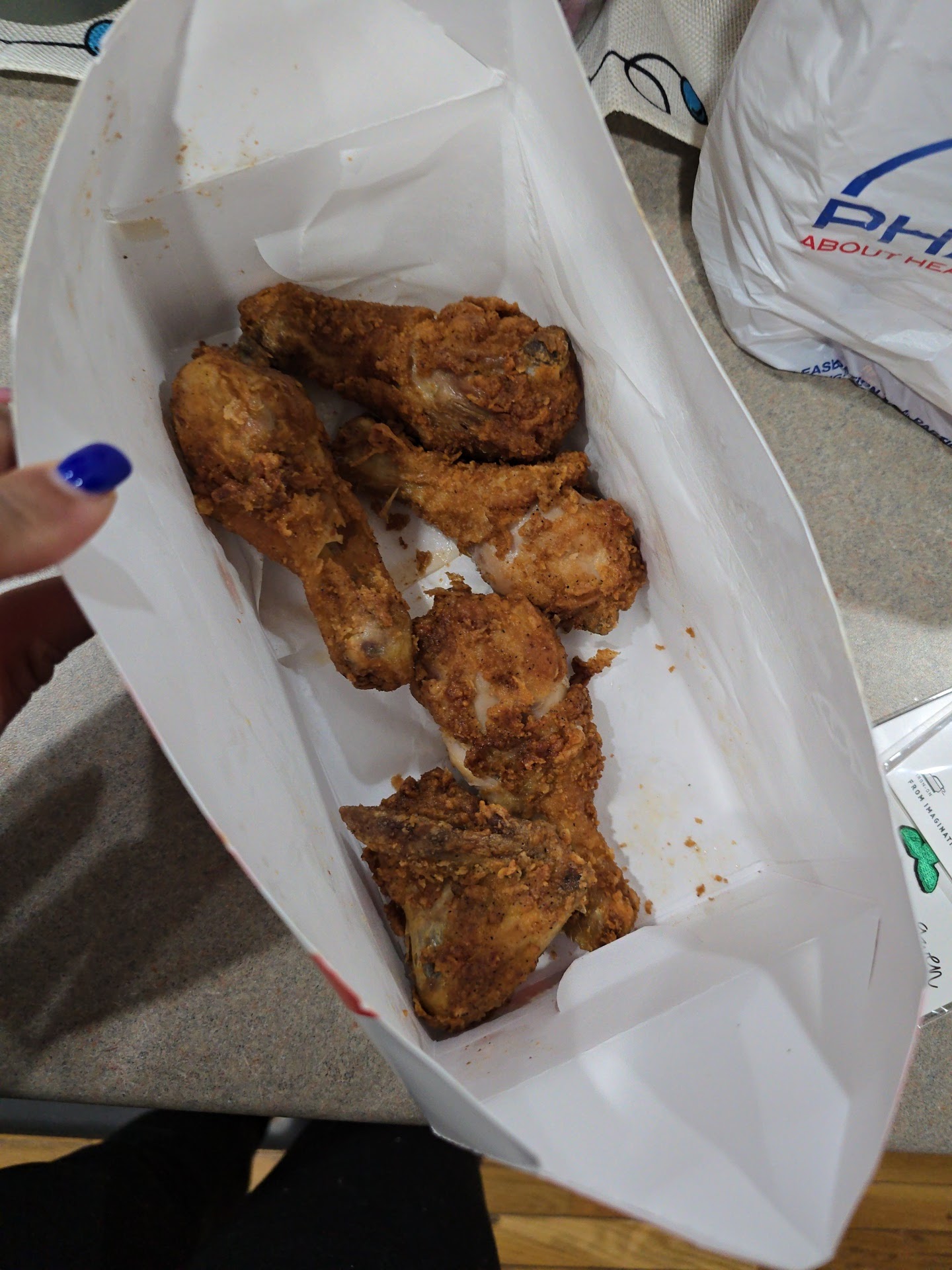 I placed an order for a 2pc chicken meal, I paid and received my food. Upon opening the box I saw the chicken was very dark and overcooked. I asked the cashier for different chicken and she did so. However, the chicken was still overcooked and burnt looking.