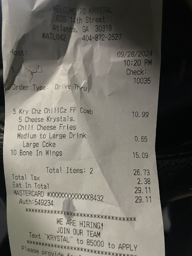 Read moreI will never return to Krystal after receiving the threats from a cashier I believe to be named Derrica. I came thru the drive thru as usual. Paid and was given my orange juice. Then the cashier tells me to pull forward and the blue mustang behind me to not move up, creating a gap at the window. A couple of minutes passed and the cashier tells the mustang to move forward to get there food. They get there food and drive off and I’m still pulled up forward. The cashier then leans out the window to prompt me to reverse back to the window. Had my window not had been rolled down I would of heard her. I told her could y’all bring my food out like any other time verses me backing up to the window. She immediately began to speak over me and became very hostile. I simply didn’t know what was going on. I had literallly seen someone walk a food order out before me, so I wondered why u couldn’t get the same. I request a refund and she begins to curse and yell at another employee to come inside and give “this man” a refund. Once inside we exchange words on why I was upset but she wasn’t hearing it. Spoke over me. Called me a “dumb ass”, said she don’t make me “call my folks”. Carrying on as if she was in the streets. 10:15 in the morning. One older lady was so blown away that even she made a comment as the other coworker finally gave me my refund. I was embarrassed and totally...