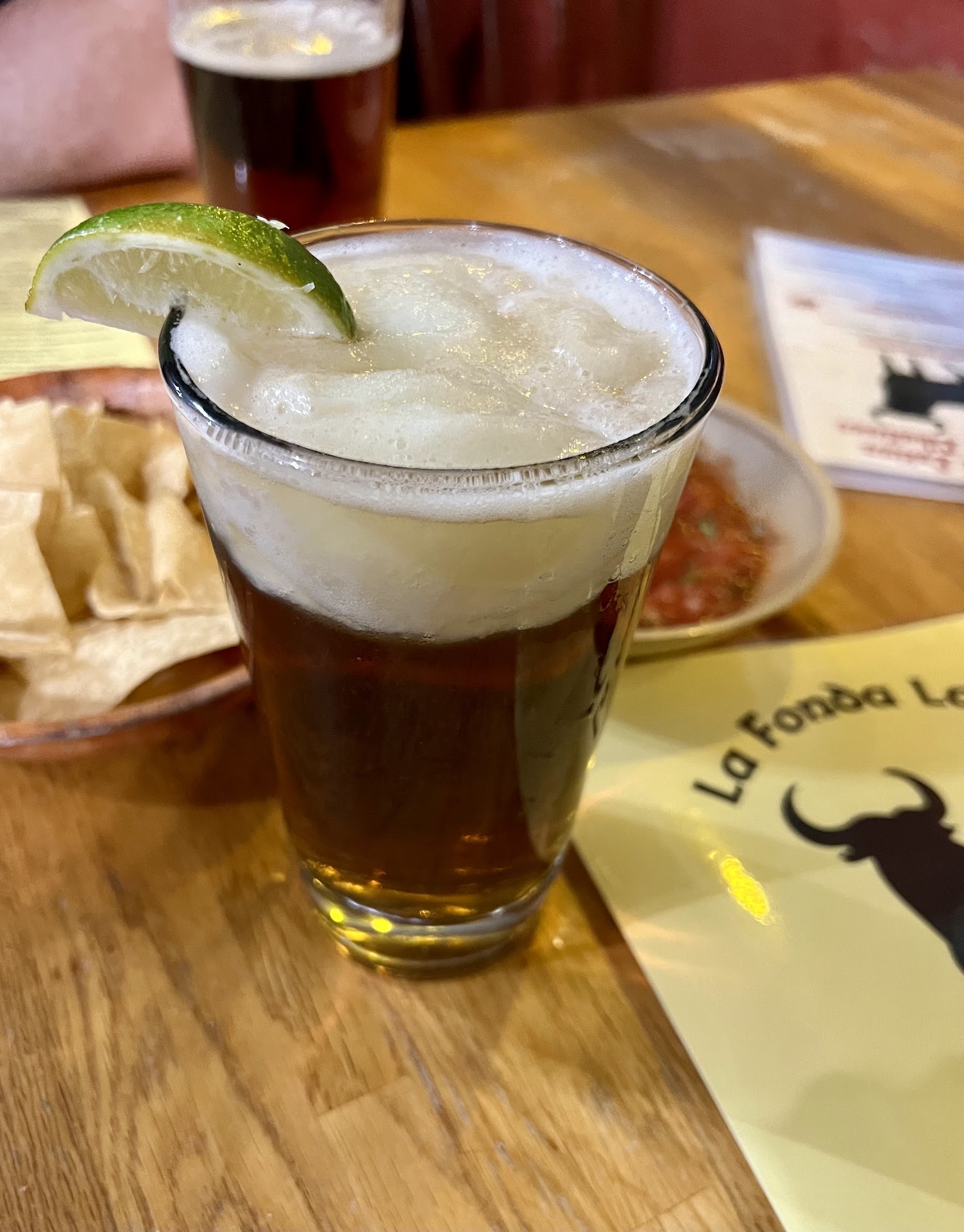 I had a Mexican Iceburg to drink - Dos Equis Amber beer with a big burg of frozen margarita floating on top. The lime is delicious as it melts into the beer.