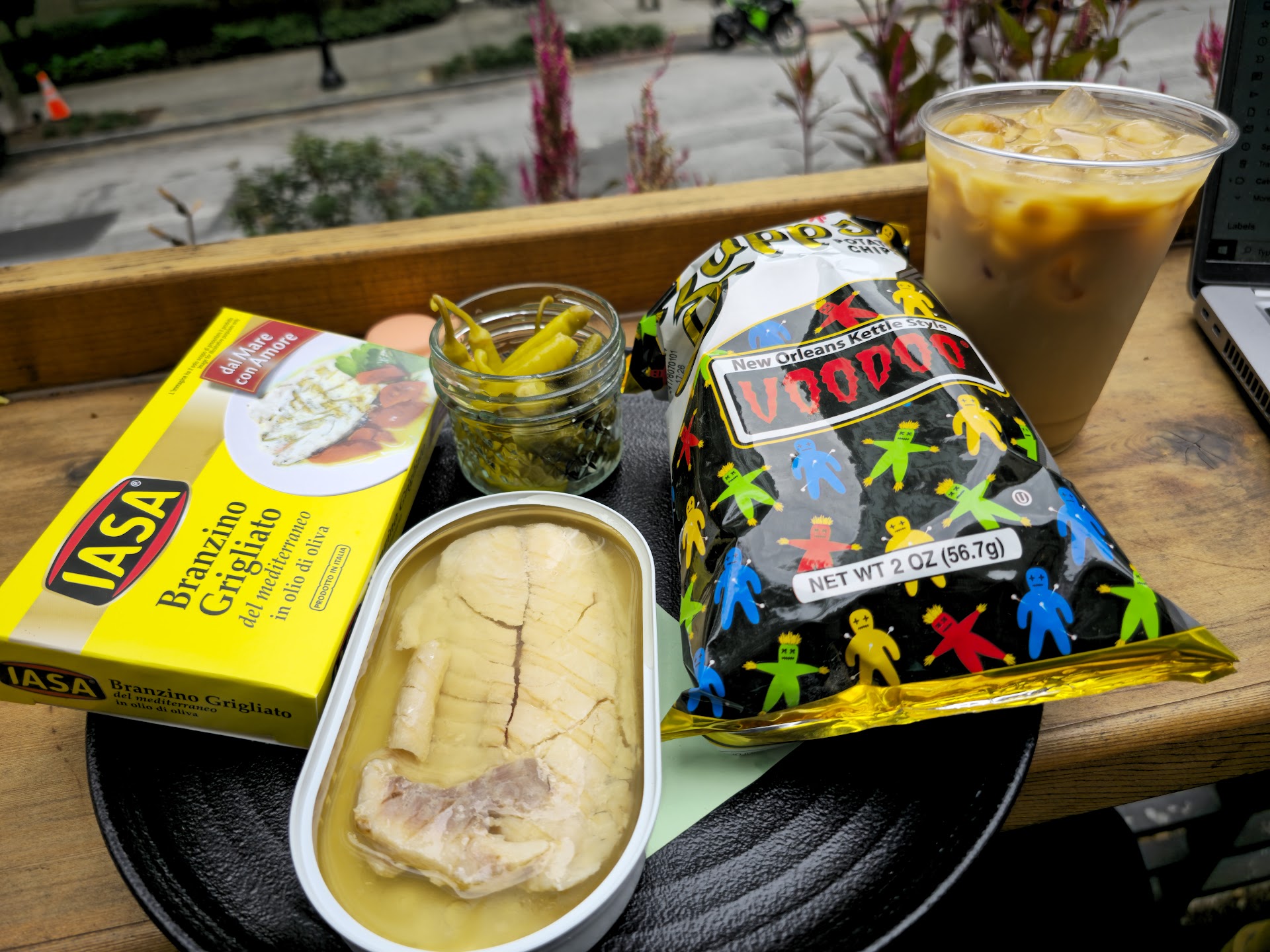Ā Ā Ā Read moreThis is just an all-around interesting place. I came for some coffee and fish tins (how often do you hear somebody saying that!?). They have an extensive and attractive list of fish tins (which I love) and I haven't come across many places where I can dine out and have them. The coffee menu has no frills (which I also like). They serve up wines and breakfast sandwiches, too. The branzino I had was tender and excellent all-around. Unfortunately, they were out of bread, and having that with chips made it feel like I was getting less bang for my buck -- you can't really sop up all the good juices with chips like you could with bread. My iced latte was decent, nothing crazy. All seating is on an outdoor patio, so it's a perfect fit for a nice day. There's good WiFi outside, too. I think there was potential for a better experience here, but I left pretty...