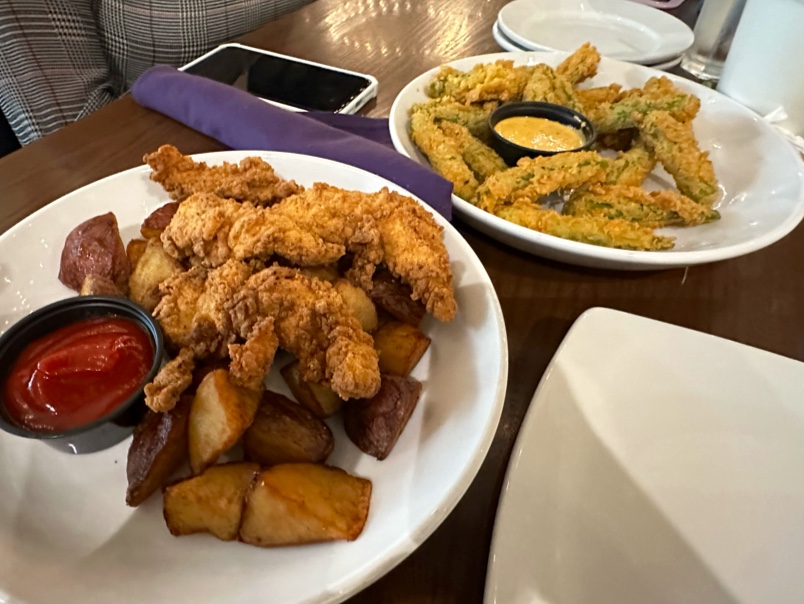 Anywhoo…we ordered chicken tenders for the kids which came with potatoes and fried okra for appetizers. It came out in less than 10. The kids’ potatoes were really good, just a lil spicy for kids in my opinion. The fried okra was amazing! And the sauce that came with it. Spicy but doable.