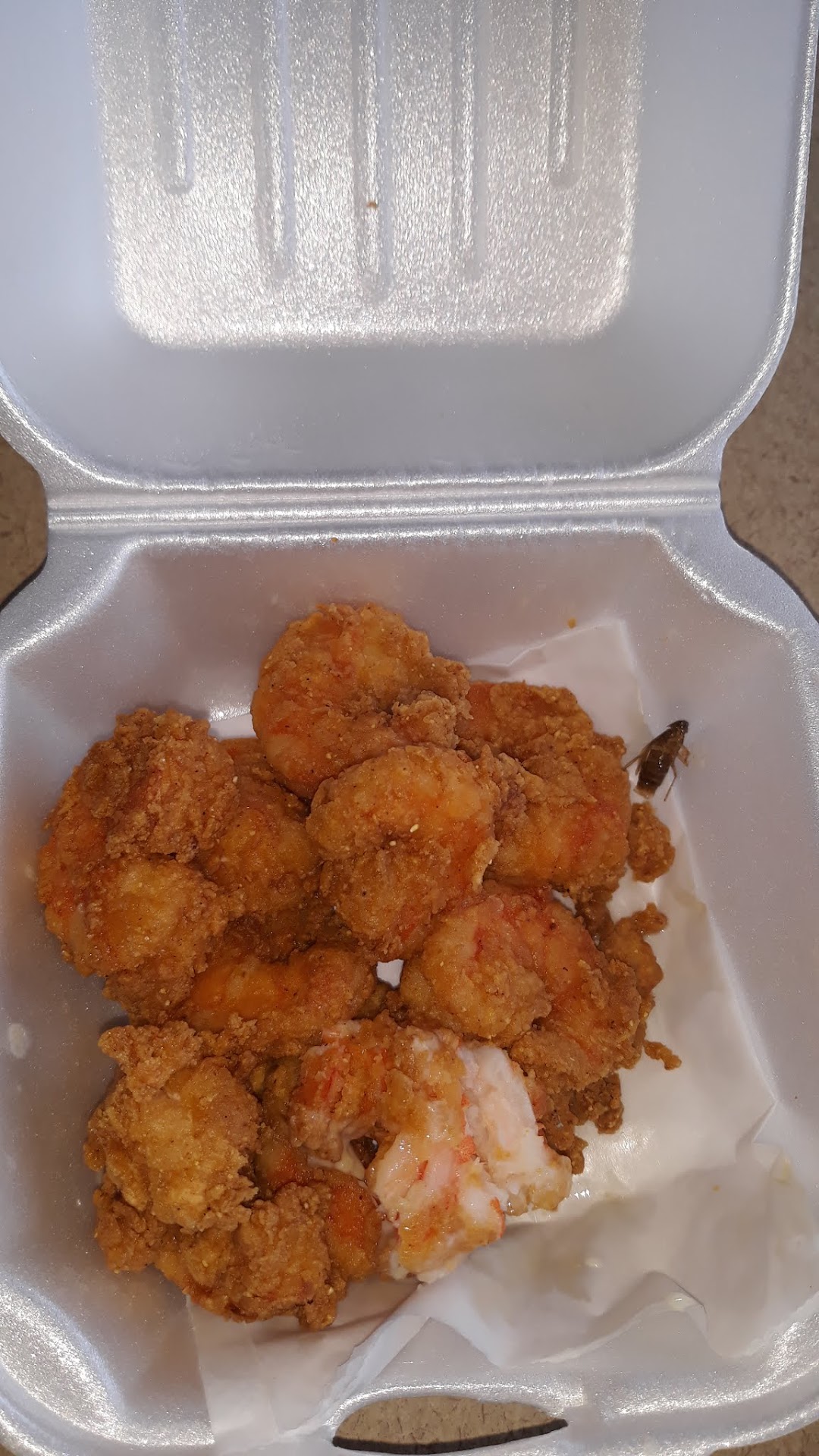 It was a terrible experience because: I ordered shrimp and I found a live roach was under one of the shrimp. It was on its back with its feet moving. There was a different man working there and he was not friendly at all and he starting yelling at this elderly female customer in a wheel chair. She never raised her voice or anything and she just left. He was so rude to her.