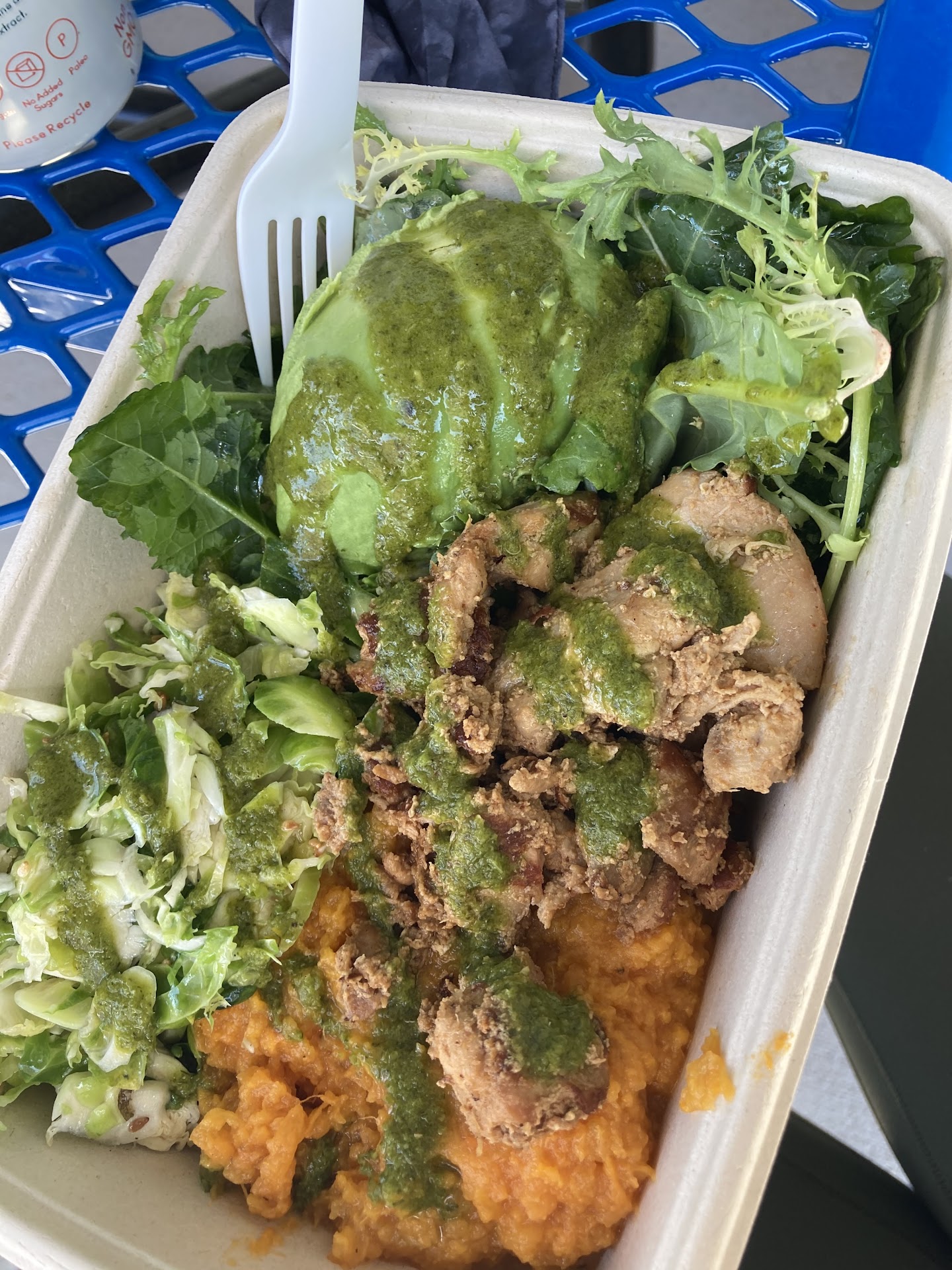We tried the pork, rice, sweet potato mash, green beans, Mac, and a few sauces. All super tasty and healthy! And the watermelon juice “Greaterade” - which was good, but will be better once watermelon...