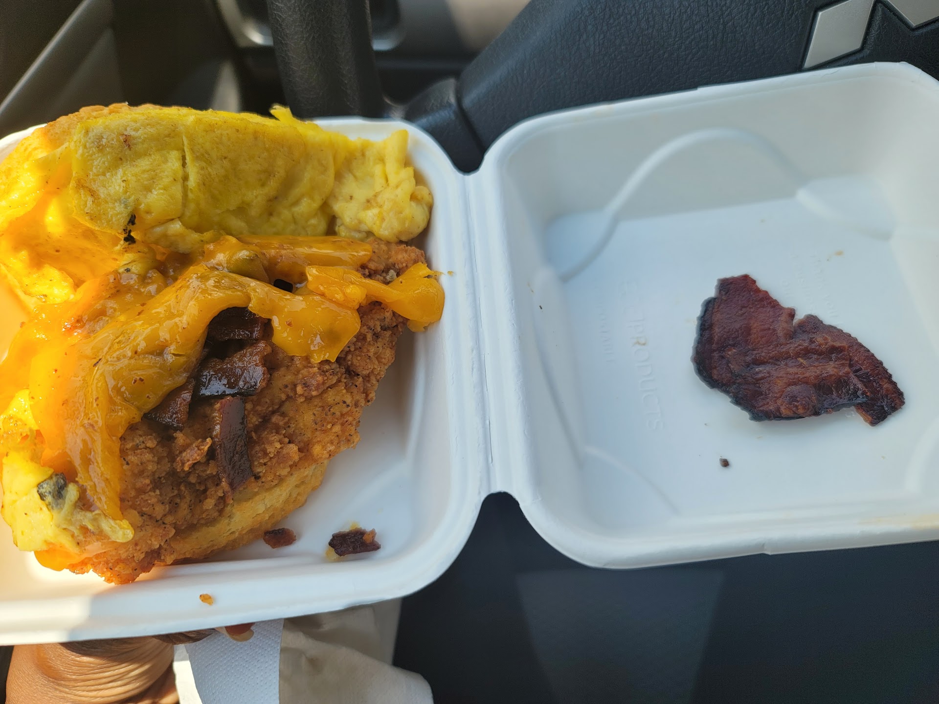 Bacon Too large pieces of bacon, which did not appear to be fresh. It was cooked perfectly. Well, it was a little of on texture - 6