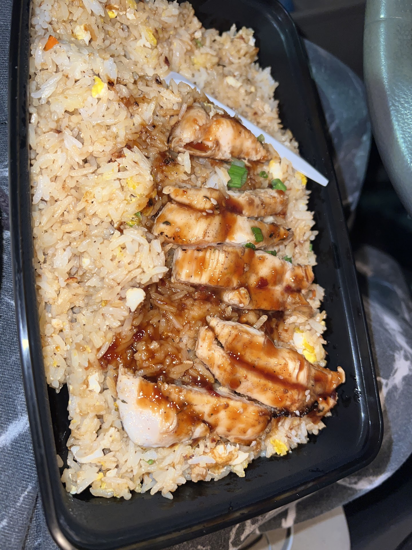 Now that that's out of the way, we should get to the food. MattChews offers some of the most generous serving sizes of rice plates I've ever encountered from a takeout place. The containers seem like they're the same size as any other place, but don't be fooled. These have a deeper bottom AND they're wider (we got home and checked - all our other Chinese takeout containers are laughably puny next to these), which is why you'll see some higher prices on the menu. We ordered the fried rice with the salmon and egg, which was just stupendous - a generous portion of perfectly cooked salmon and a runny egg whose yolk sauced the rice underneath in the most lascivious manner.