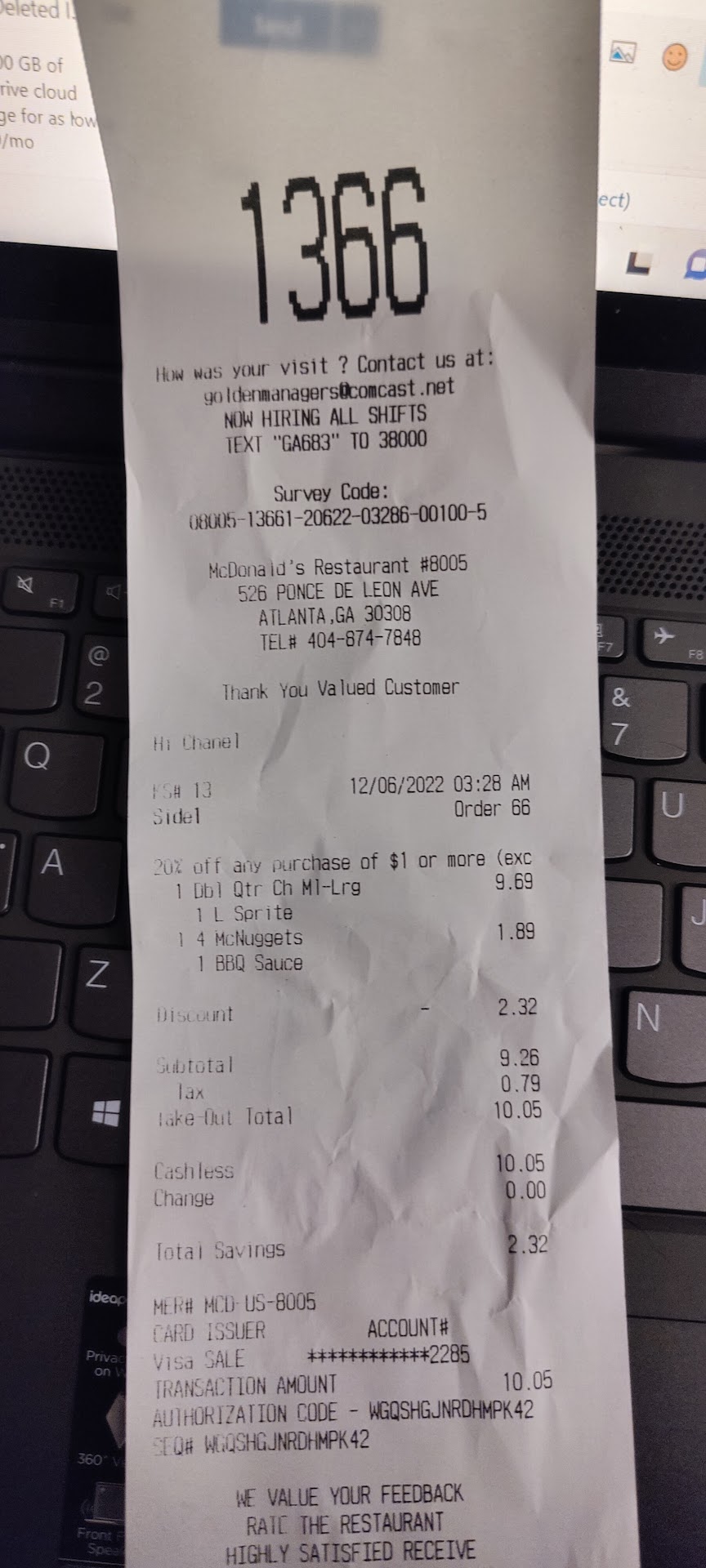 Read moreI recently visited the 526 ponce de leon ave mcdonald's location on 12/6/22 at 3:28 AM. I placed a mobile order and proceeded to the speaker to give my code. When I got there, I said "Hello!" and heard a very loud yell "HOLD UP." I told her "Why are you yelling at me?" and she said "why are you saying Hello?" I then told her (very appalled that this was why this woman was yelling), "to let you know that I'm at the window." I then gave her my order number and when I approached the 1st window, I asked what her name was. She then looked at me straight in the face and closed the window and walked away to the 2nd window. At the second window she told me "Quisha, my name is Quisha!" and just stood there. I asked her if she had taken my order and she confirmed she did. There were 3 other workers around her. I then told her "That's all I need to know." She then responded "Oh, I know." I then asked to speak to a manager and with all the 4 staff there, the same woman who yelled at me at the speaker, said she was the manager. I was in disbelief. I live 3 minutes away and always come to this McDonalds and had never been treated so poorly by staff here. I truly hope that this message reaches a management that actually cares about their customers because the "management" I supposedly encountered, clearly did not. I would not recommend this restaurant to anyone I know given what I experienced here on behalf of "management." NOTE: the receipt says "SIDEL" took my order. Please let me know if there is any more information, I can provide you. Also, find attached the receipt...