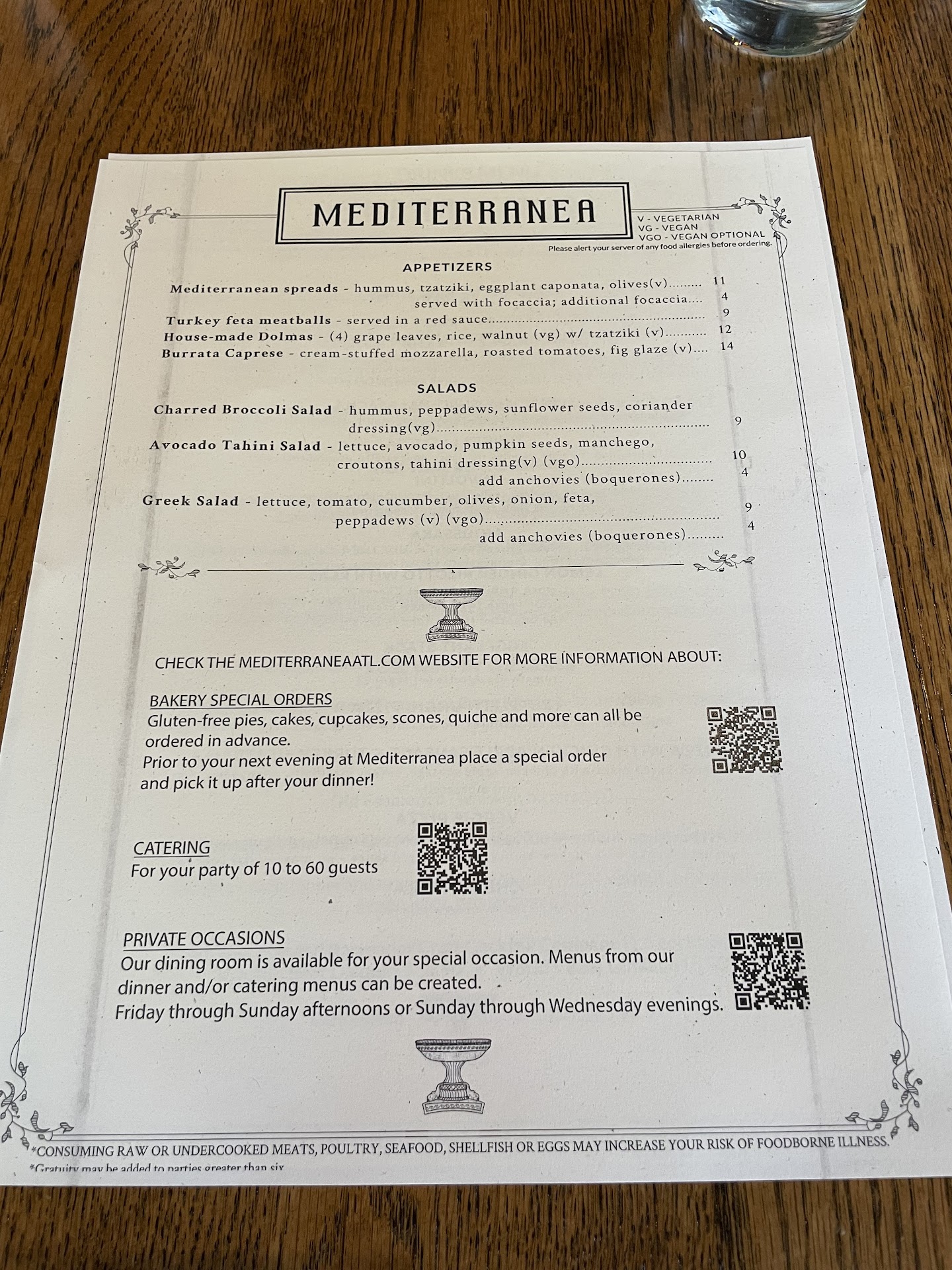 I've visited Mediterranea three times, and I've enjoyed it each visit! I loved seeing this place open up in my neighborhood, and it's become popular very quickly. Our first time there, we hadn't made a reservation, and there was only room at the bar. The atmosphere of the small lower floor dining room is intimate and romantic. The staff is friendly and happy to tell you about the dishes and make recommendations.