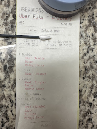 Read moreWe ordered via Uber Eats. My son likes trying new burger joints anytime we go out of town. He read about the Midnyt burgers and their secret sauce and wanted to try it. We ordered 3 burgers (all with midnyt sauce on them), 2 orders of fries with 2 midnyt sauces to dip them in, 1 of the garlic aioli sauce to try, and 3 packets of ketchup. The total was a little over $57. We got 3 burgers with NO SAUCE, 2 orders of fries without any sauce, and 2 packets of ketchup! The food was good, but we still haven't gotten to try the "famous" Midnyt sauce!!! I even ordered extras to try their sauces. All we got was 2 packs of ketchup. The prices were reasonable for the amount of food you get. $57 fed my family of 3. My son said the smash burger and fries were good, but would have been better with sauce we ordered and paid for. We may try to eat there again, but next time we will eat in the restaurant, so we can make sure our order is correct. If you do a pick up order, I recommend that you check your bag before you leave the restaurant. Don't get me wrong, I understand that we all make mistakes, but the restaurant is known for its "Midnyt sauce" and we didn't get to...