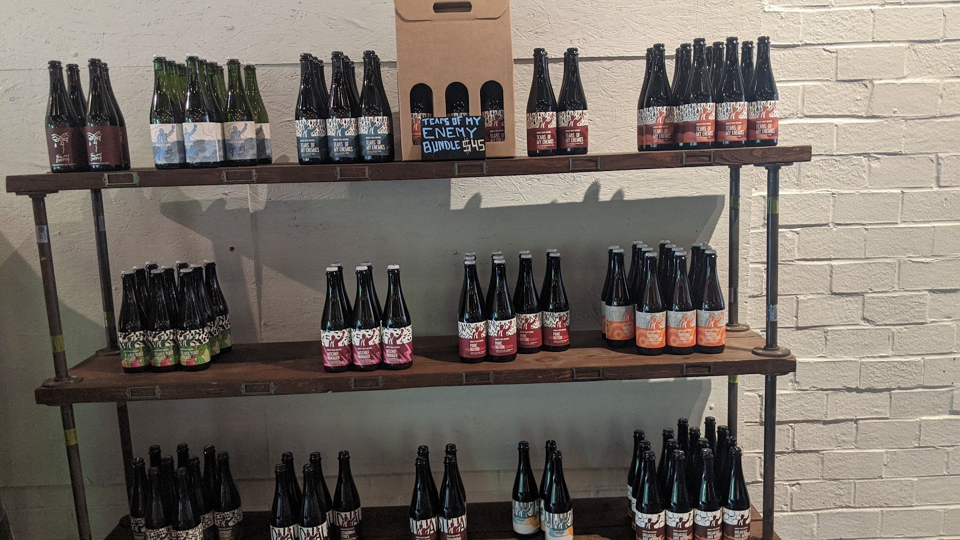 Scene/Interior/Exterior: they have a super cool outside patio that runs in a linear pattern alongside the green hillside. It is actually located near a treatment plant, but don't let that scare you because it is a long way from the brewery and it's a beautiful area where the location is nestled into. The patio was completely packed, so we went inside and it's a huge space. They have a few different areas that can be used when needed, such as a Tiki Bar area, a 360 degree bar, a soundstage for live music, and plenty of space for a food truck to operate. The tie wall is really cool (more on that in a minute).