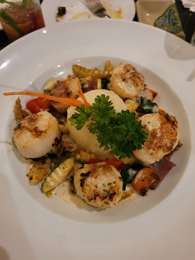 Our drinks, appetizers and meals were all enjoyable. However, we barely saw the server who was our main server. She took our food order and visited us briefly after our the main course arrived to ask how it was. All other service we received was delivered by a few other different servers. We saw our server attending to other tables in an adjacent area but our table was ignored by her and other servers. To get more drinks I had to go ask our server for them when I saw her at a nearby register. To obtain our checks more than 10 minutes after we had finished our meals, my friend had to seek her out at the same register and ask for the check to be split.